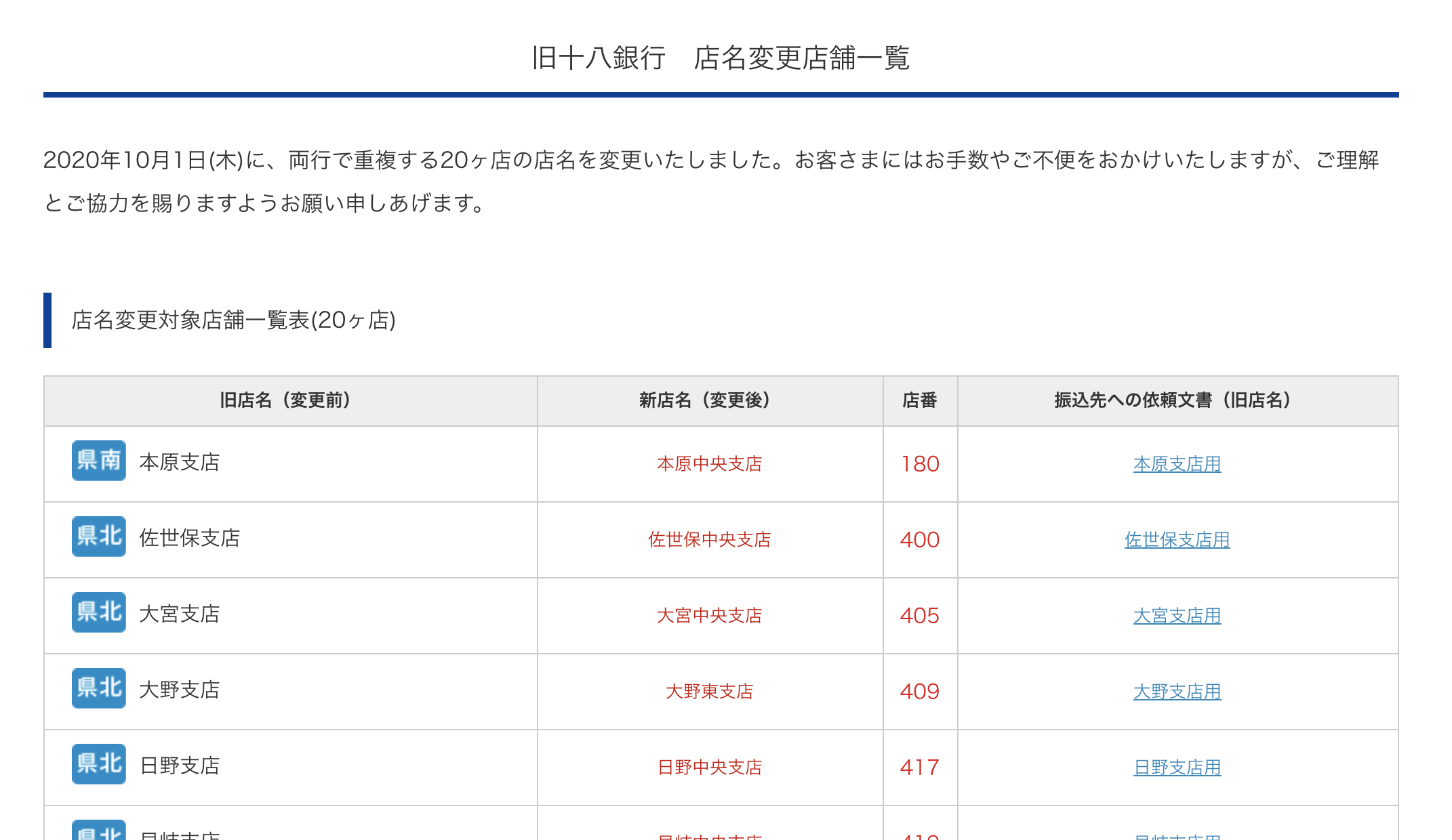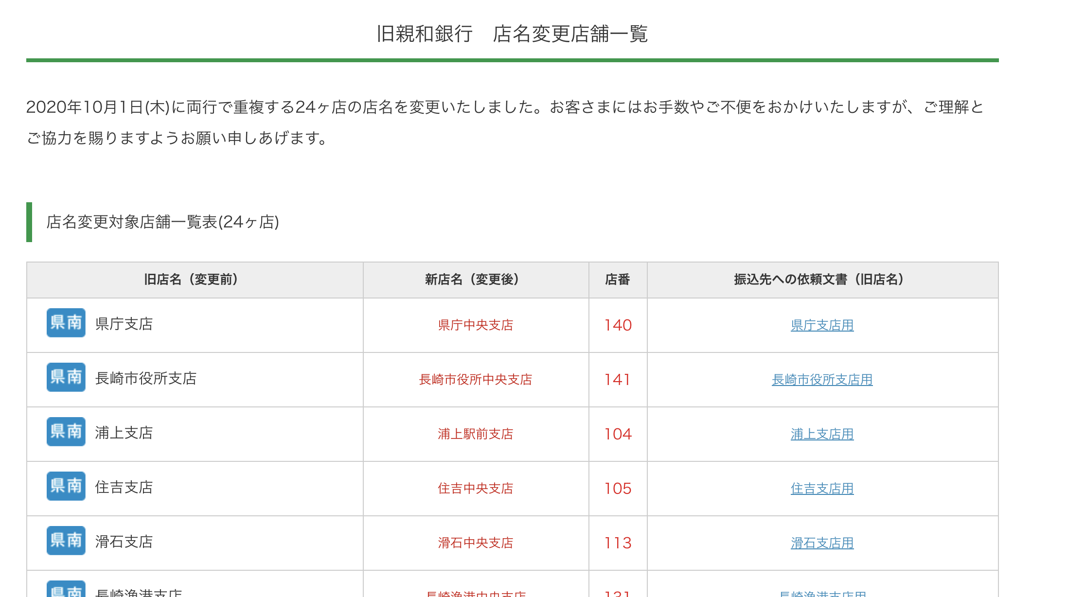 旧十八銀行、旧親和銀行それぞれ重複している店名で変更になっているところがあります。