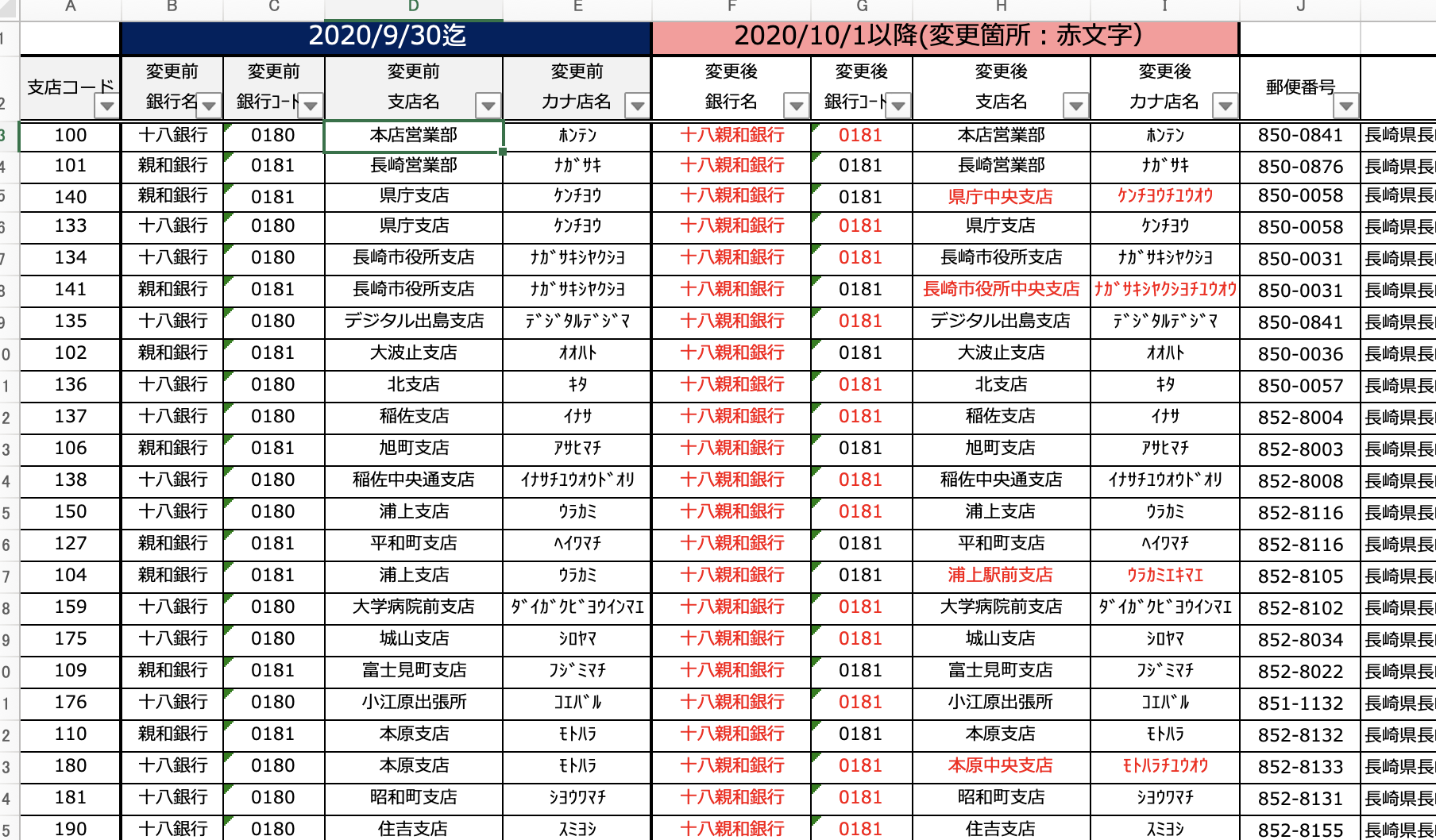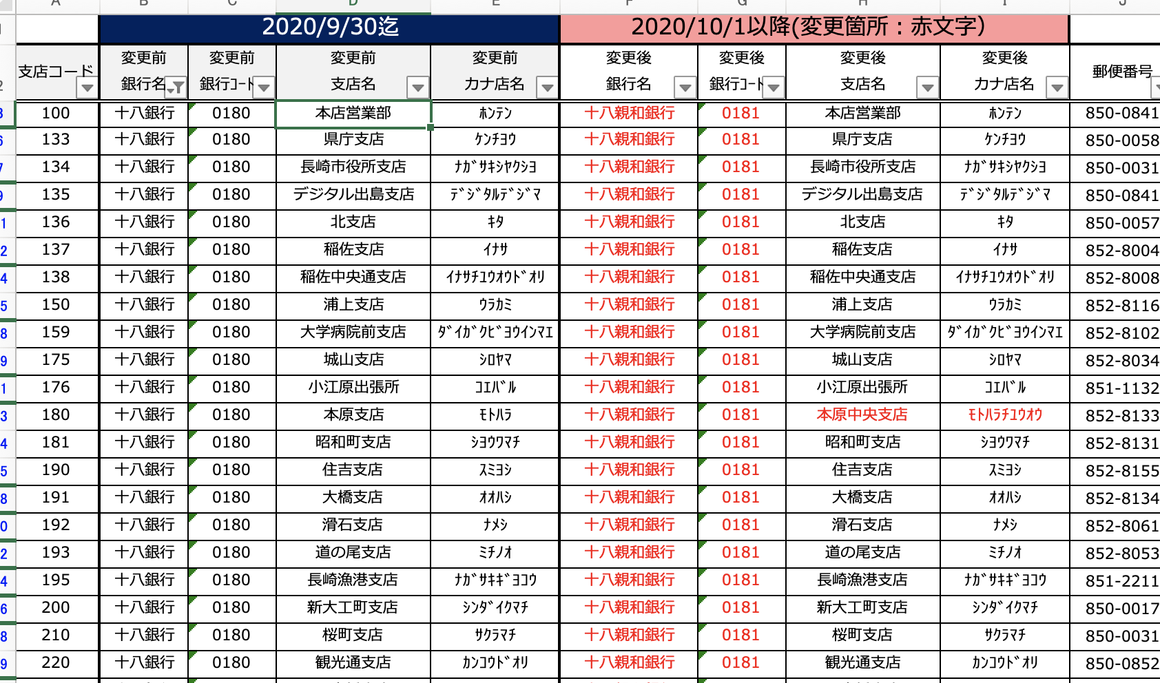 試しに、銀行名のフィルターで「十八銀行」を選ぶと、変更箇所がひと目でわかります。