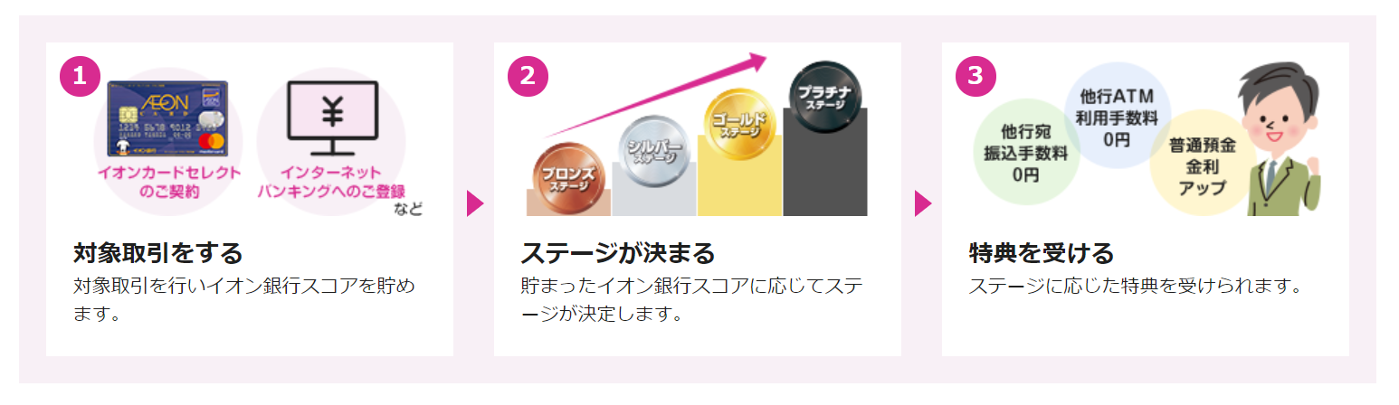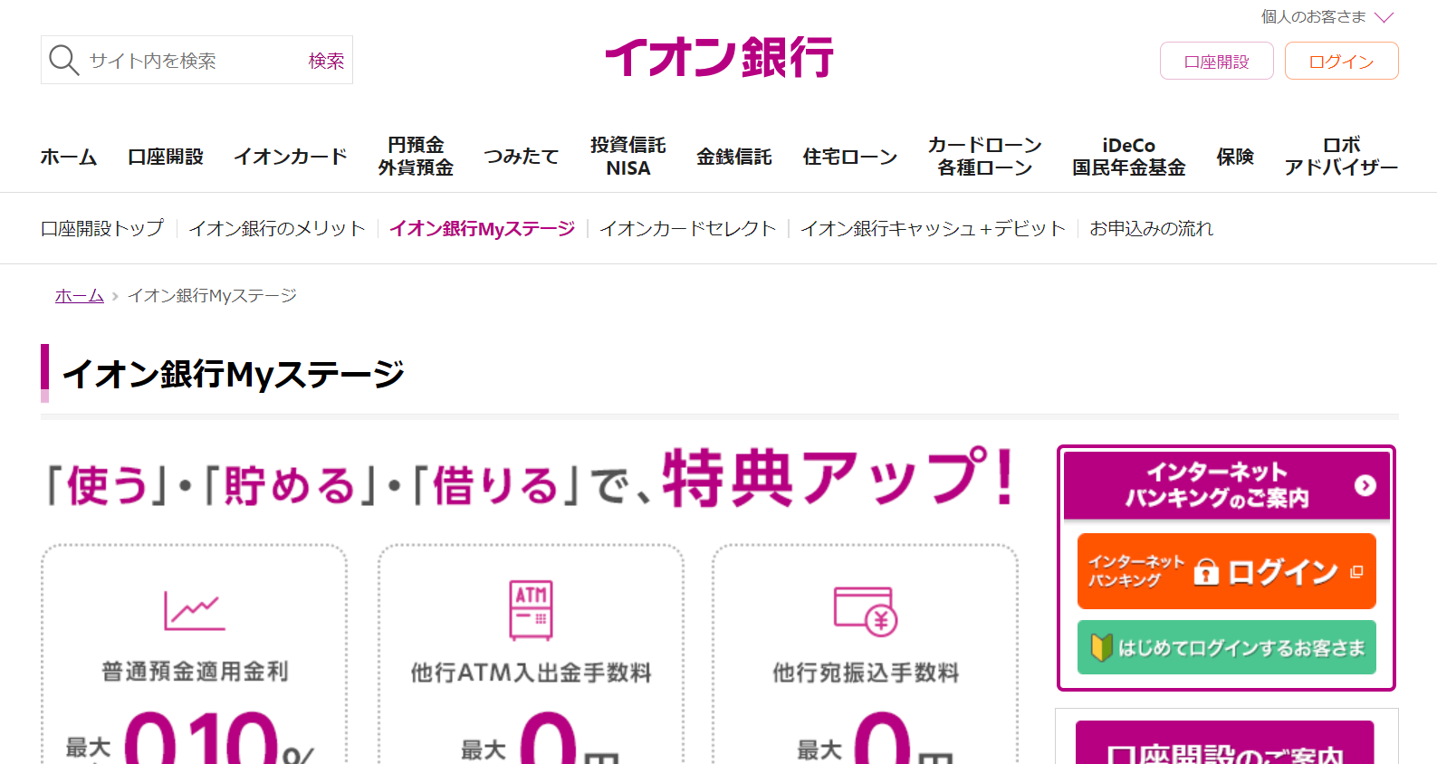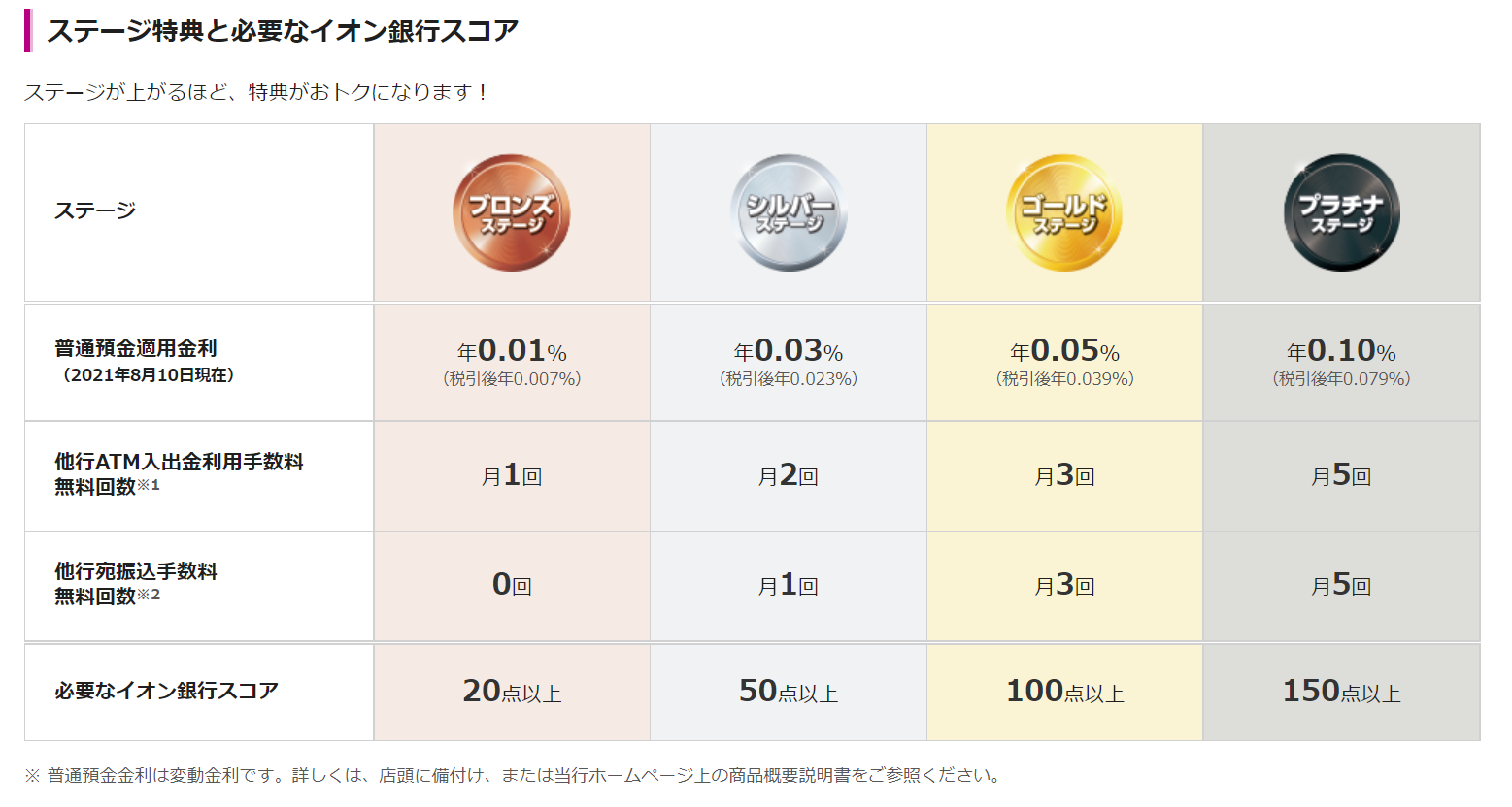 イオン銀行には、「Myステージ」という制度が設けられており、それぞれのステージに応じた特典を受けることができます。