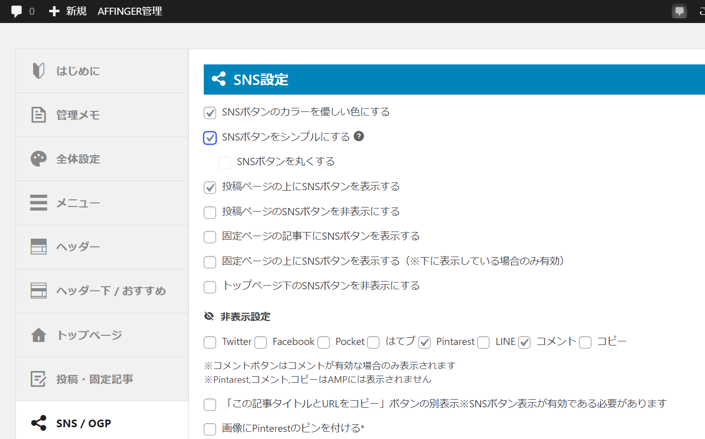 SNSボタンはAFFINGER管理画面から設定できます。