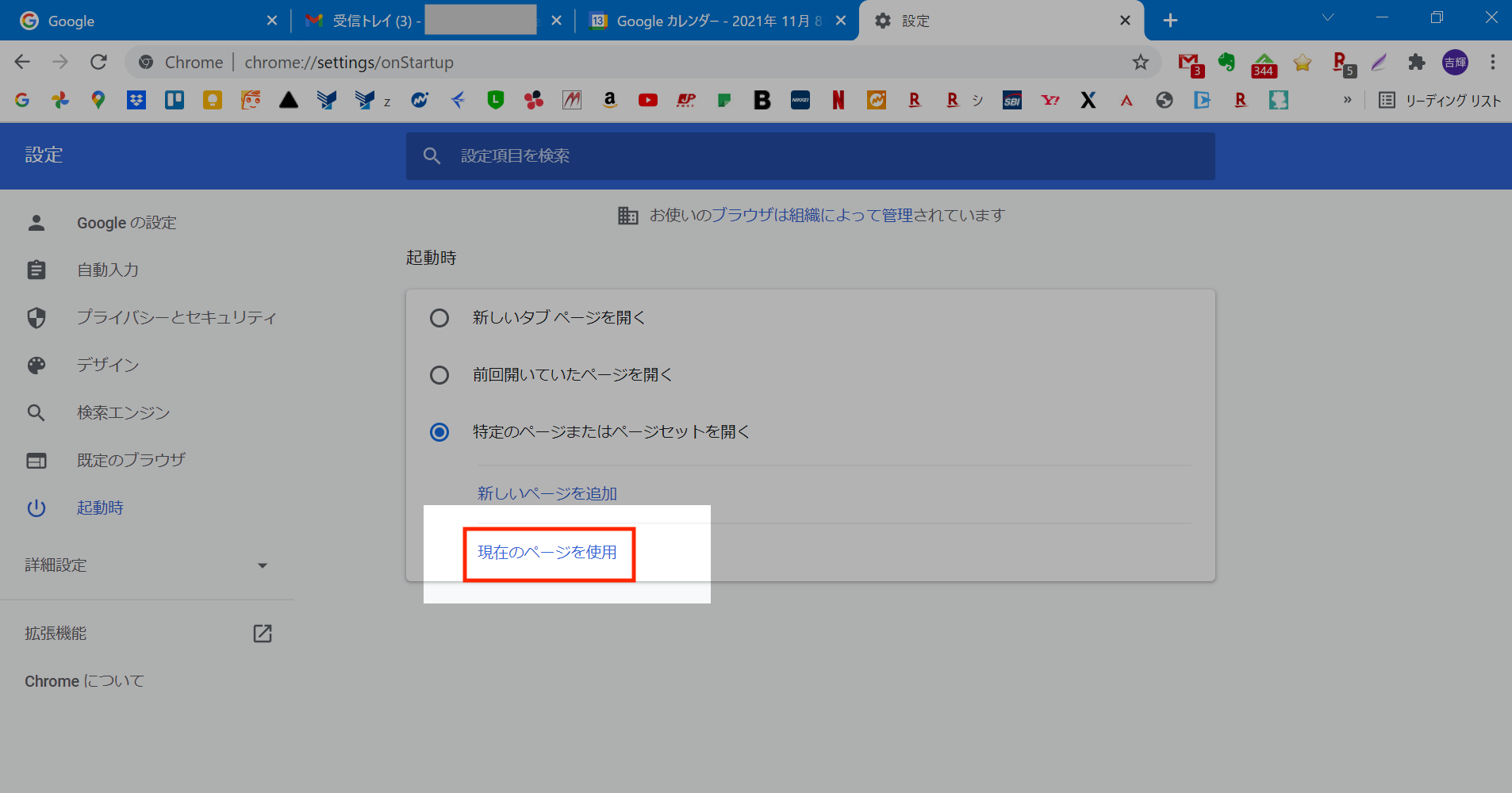 まず、起動させたときに開くようにしたいサイト等をタブで開いた状態にしておきます。