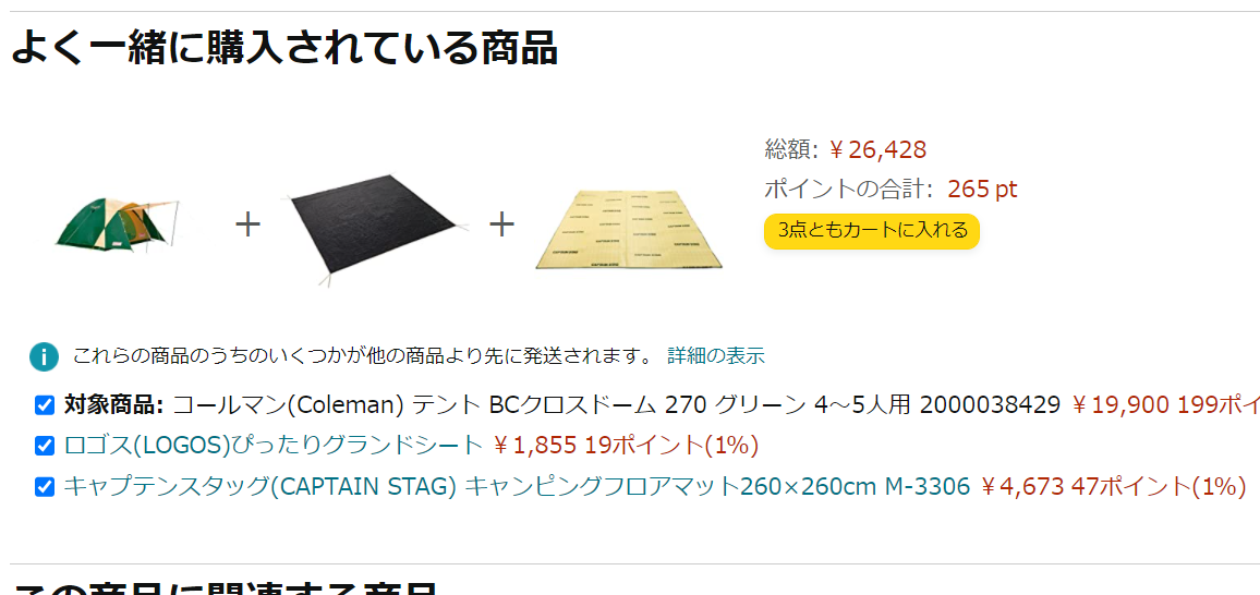 初めてこういう買い方をしたのですが、テントを見ていたときに「よく一緒に購入されている商品」をそのまま購入した感じです。。
