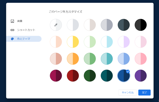 「色とテーマ」から、変更したい色を選択して完了をクリックすることで完了です。