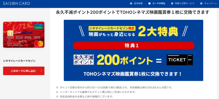 シネマイレージカードセゾン限定の特典の1つに、永久不滅ポイント200ポイントでTOHOシネマズ映画鑑賞券1枚に交換できるという特典があります。