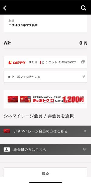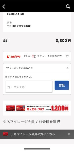 下の画面の「ムビチケまたはTCチケットをお持ちの方」の方を選択します(「TCクーポンをお持ちの方」の方ではありません)。