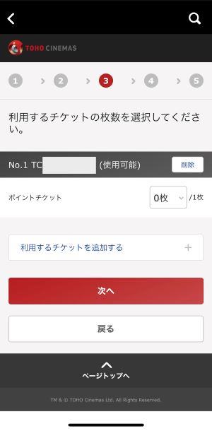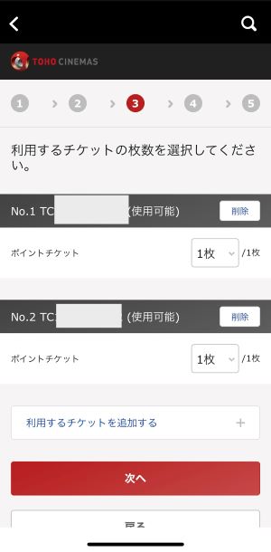 次へを選択後、チケット番号の下にある「ポイントチケット」と記載があるところの枚数をそれぞれ0枚から1枚へ変更し、次へを選択します。
