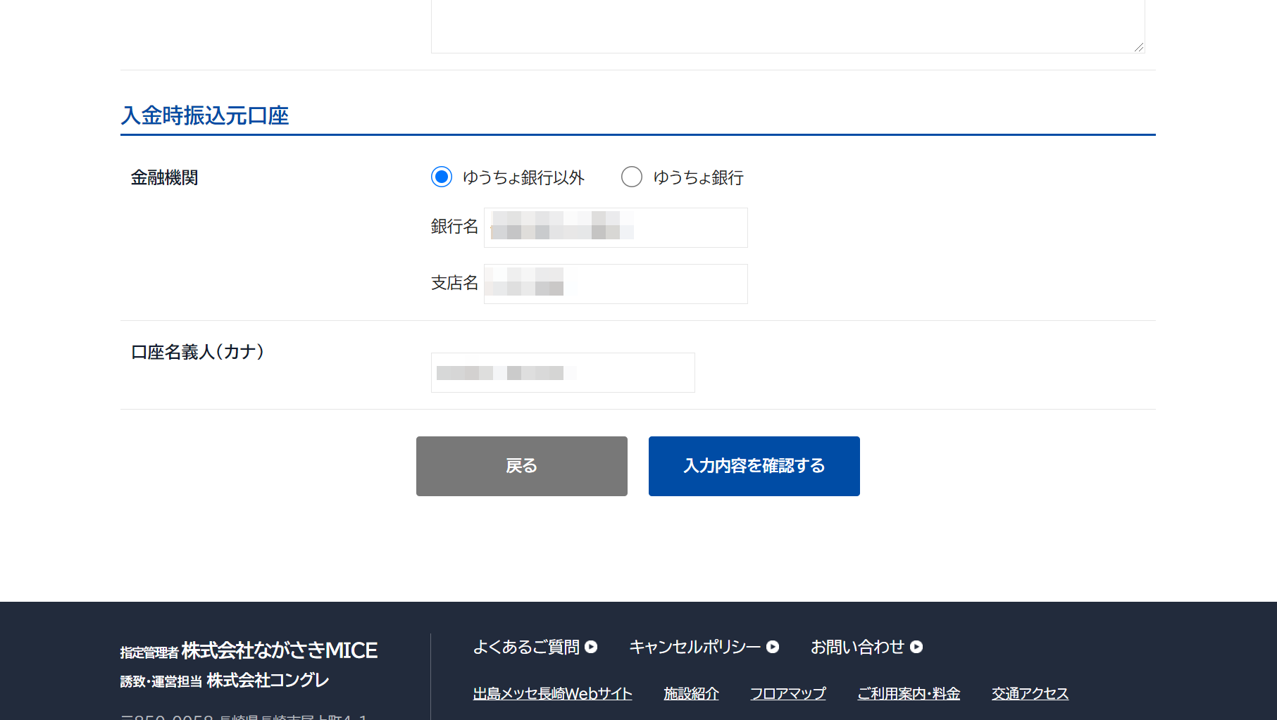 最後に入金確認用?なのかわかりませんが、会員登録時に入力した入金時振込元口座を確認し、「入力内容を確認する」ボタンを選択。