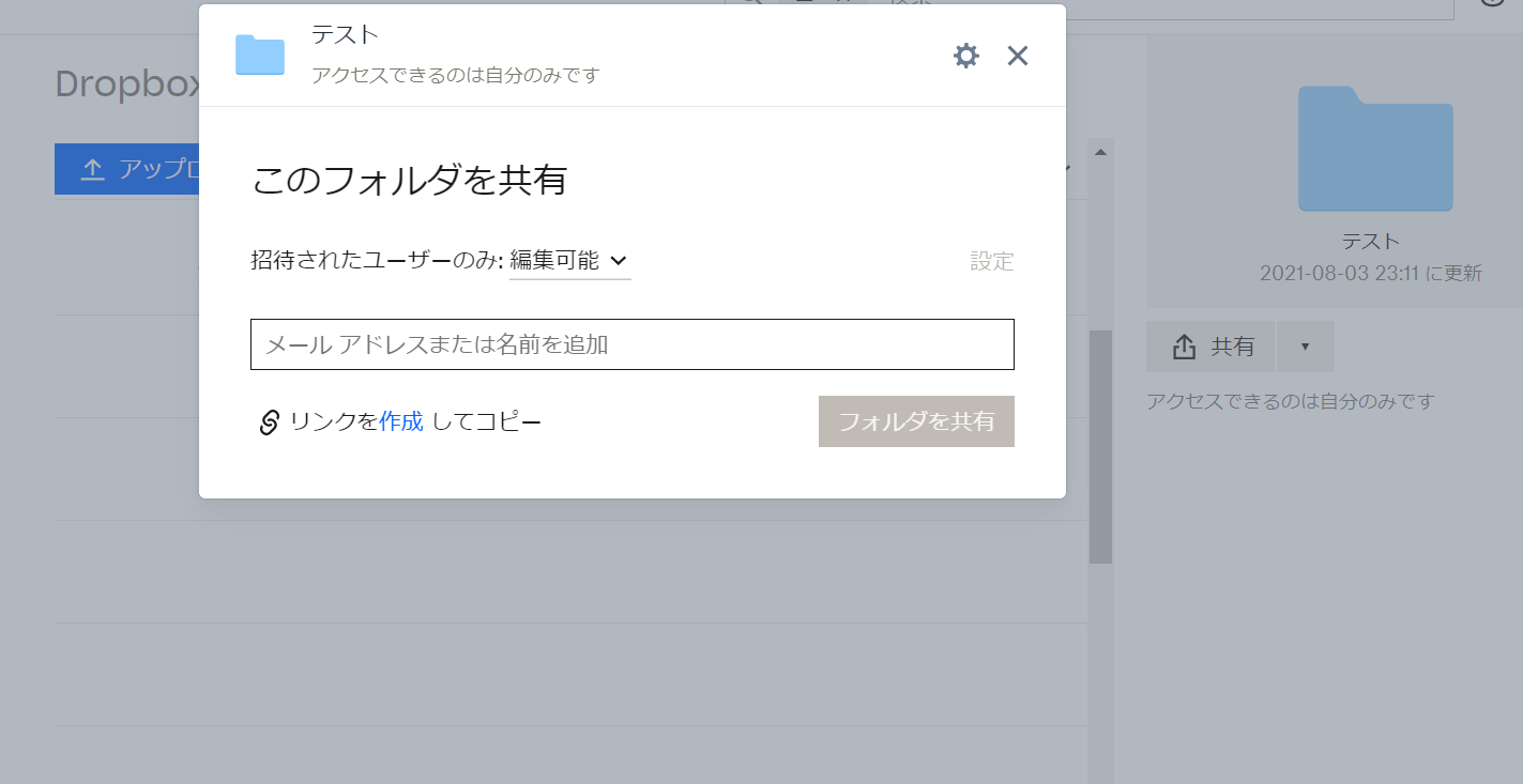 共有する手順は一つだけではないようですが、Dropboxのウェブサイトからの共有方法を紹介します。