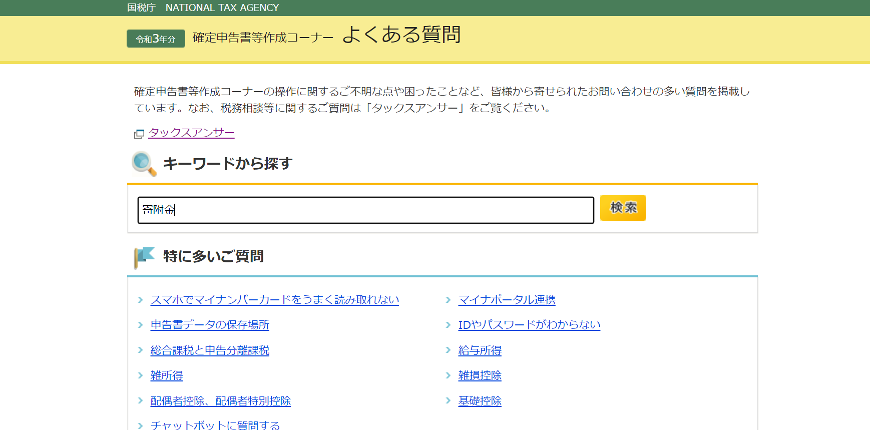 よくある質問の目次からはみつけにくいのですが、「寄附金」等で検索することで同じページにたどり着くことができます。