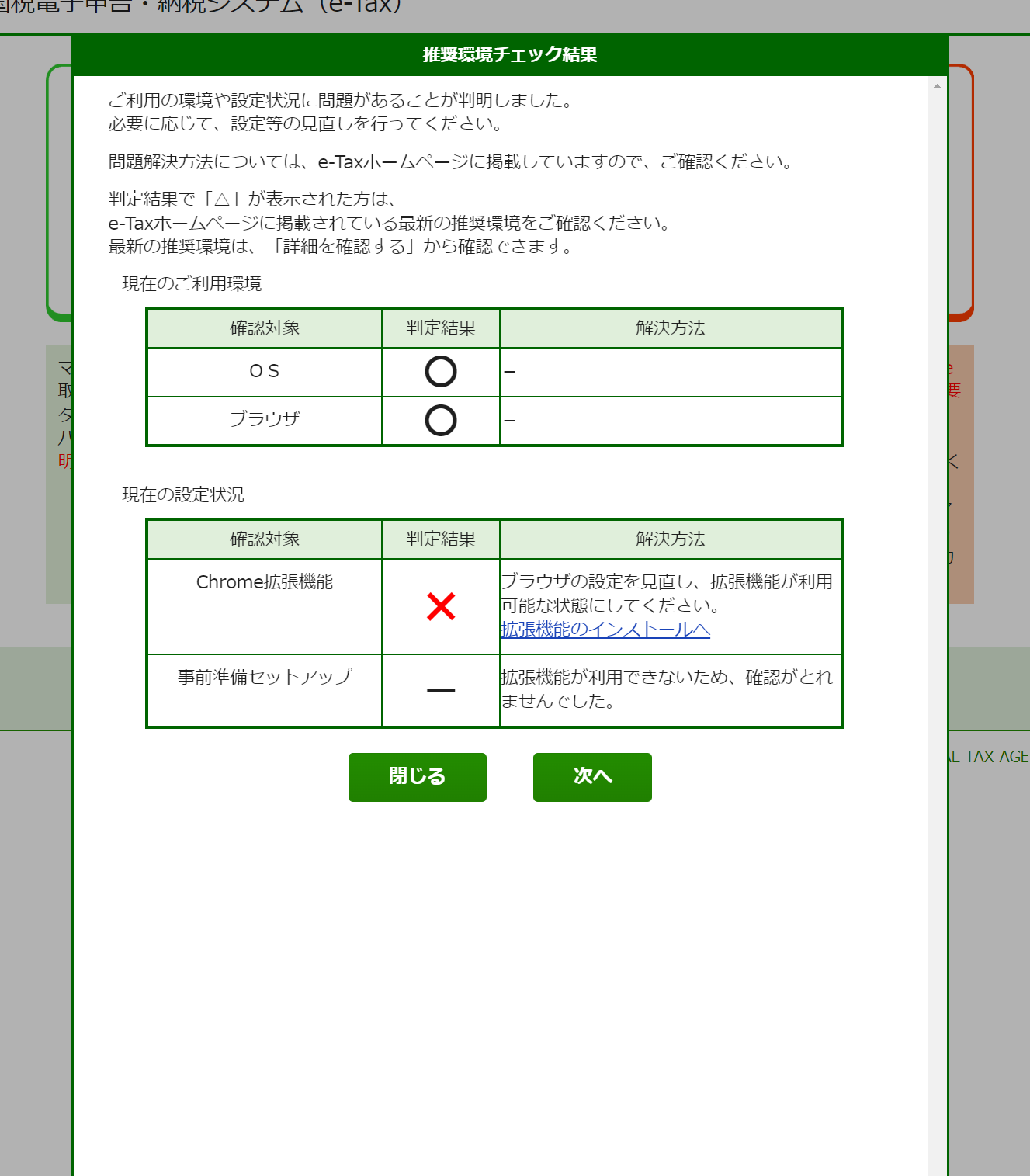 推奨環境の判定で問題がでた場合は、「次へ」でそれぞれ対応します。
