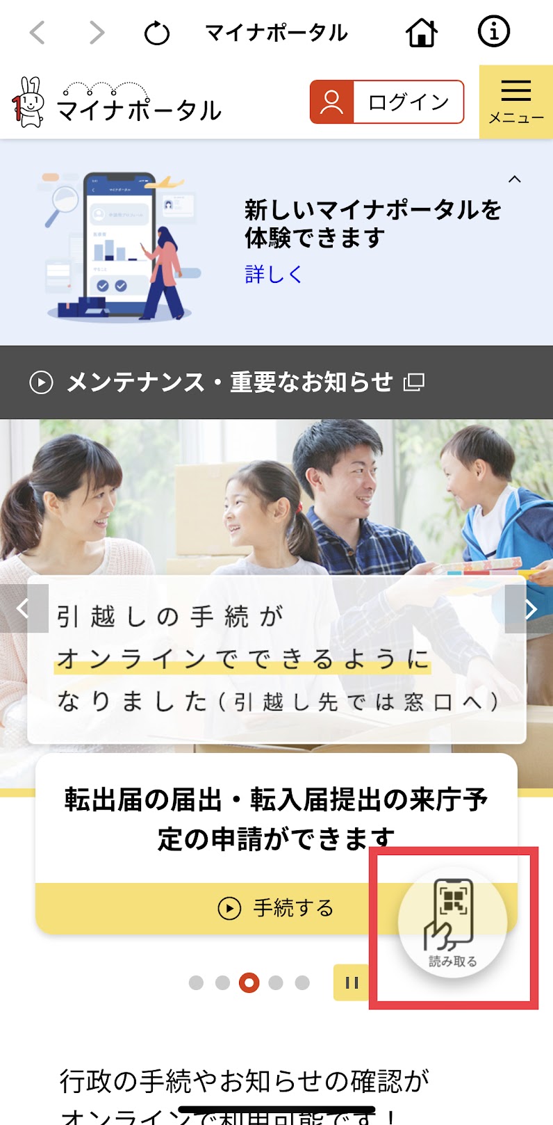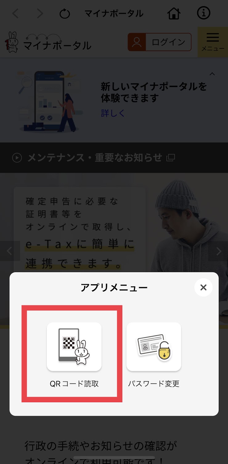 QRコードが表示されますので、スマートフォンのマイナポータルアプリでの操作に移ります。