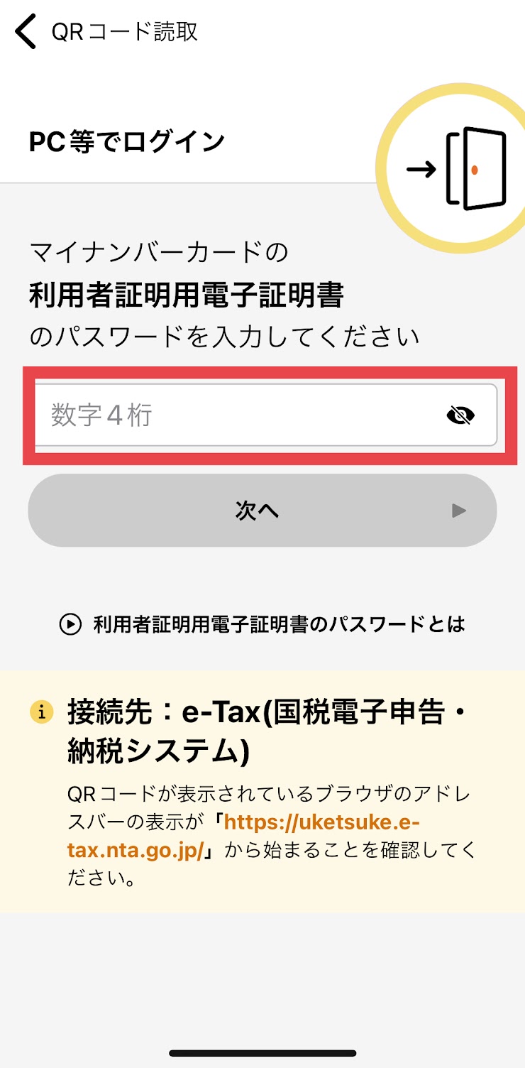 マイナンバーカードの4桁数字のパスワードを入力し、「次へ」を選択。