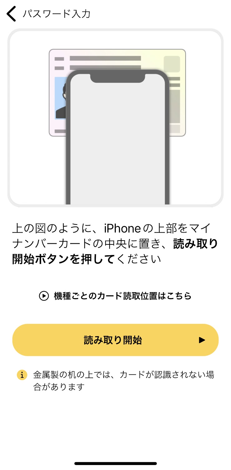 図のような位置にマイナンバーカードを設置し、「読み取り開始」を選択します。