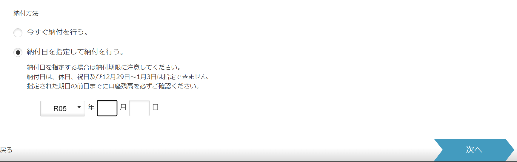 「今すぐ納付を行う。」か「納付日を指定して納付を行う。」いずれかを指定し、「次へ」