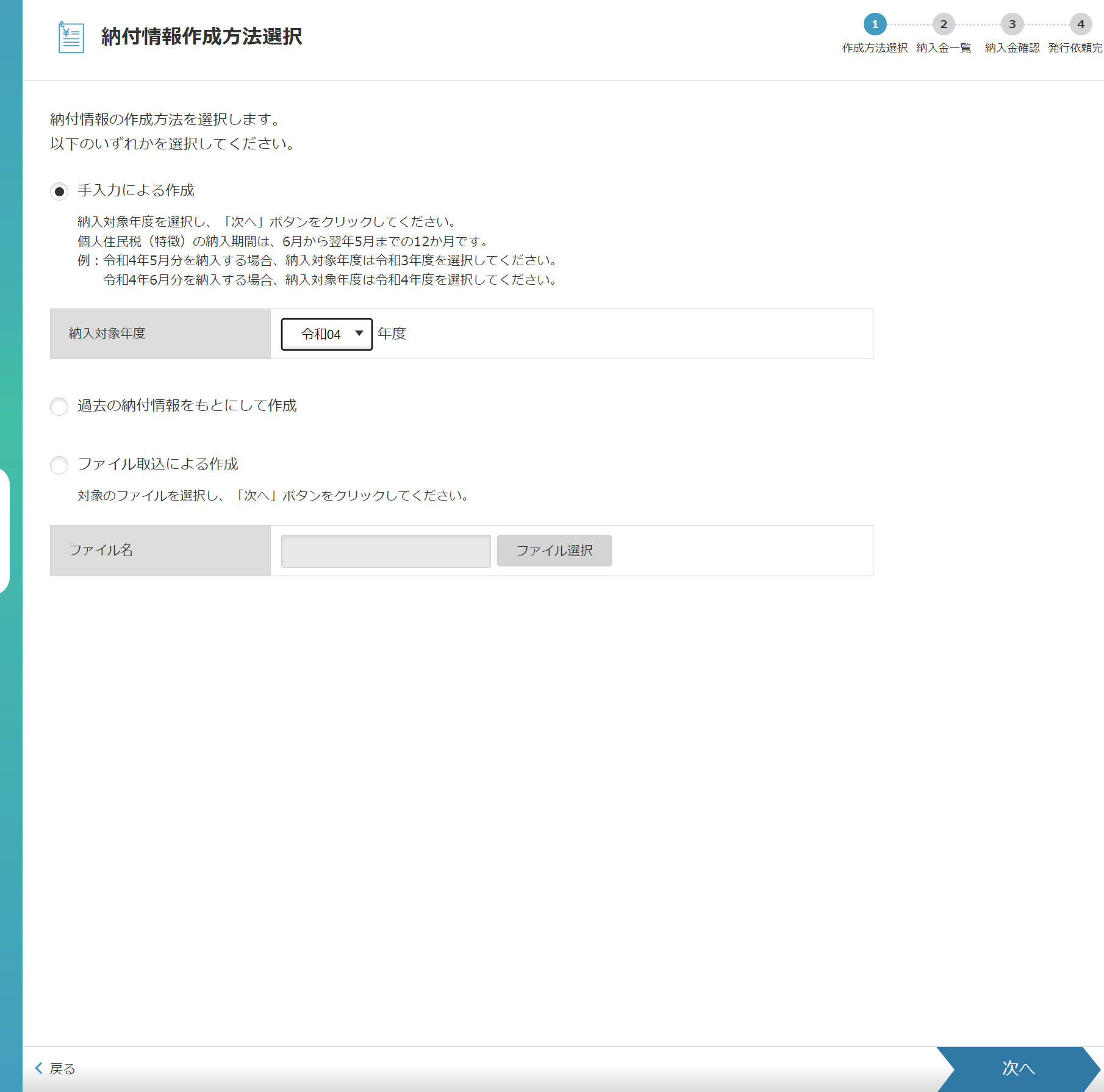 手入力による作成をチェックし、納入対象年度を選択します。