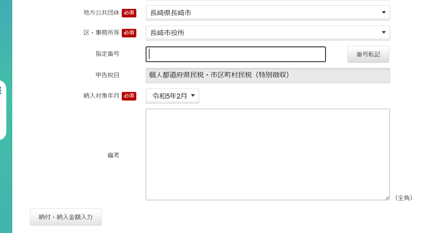 指定番号は納付書に記載されていますが、必須ではないので入力しなくても大丈夫です。