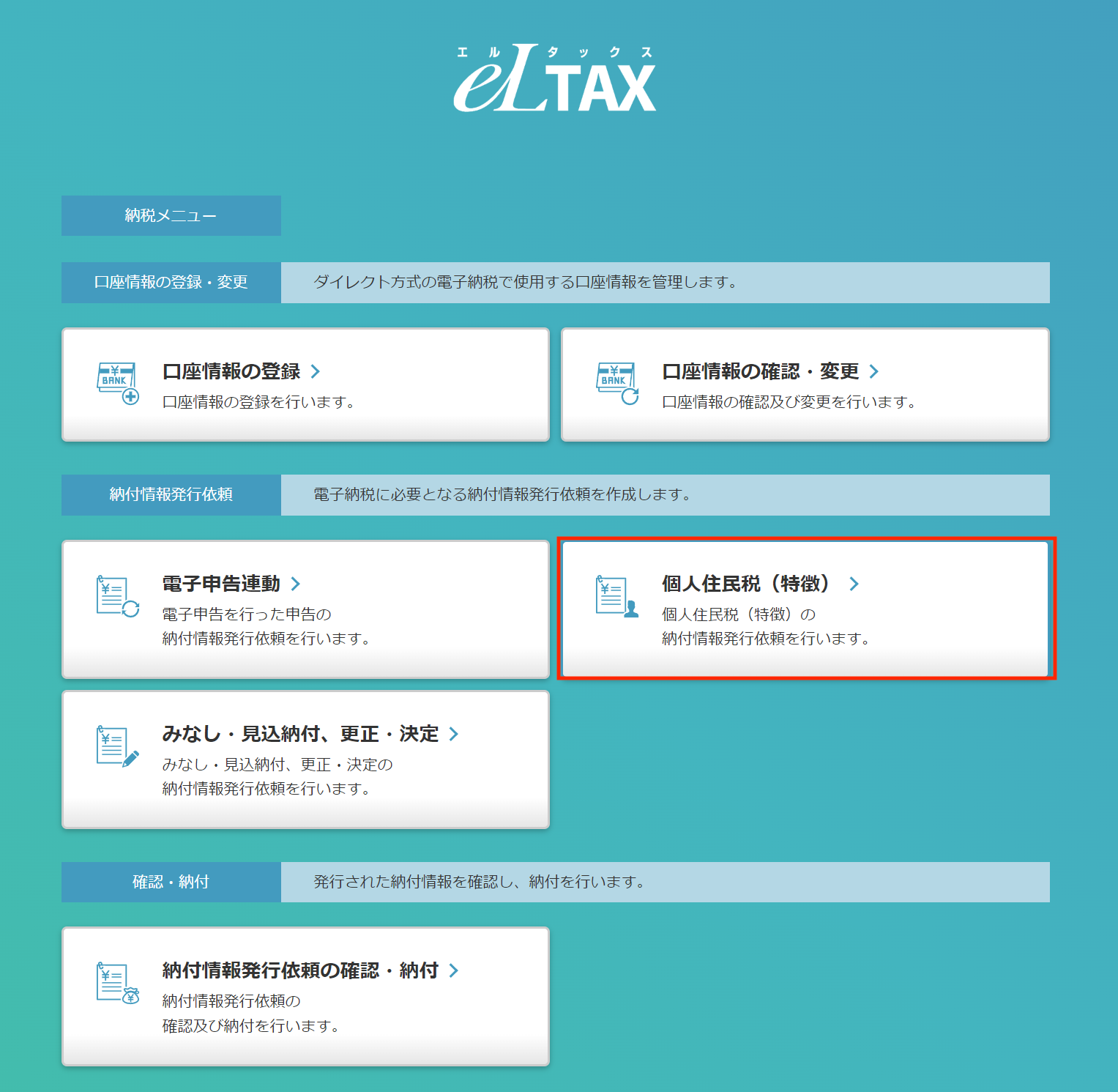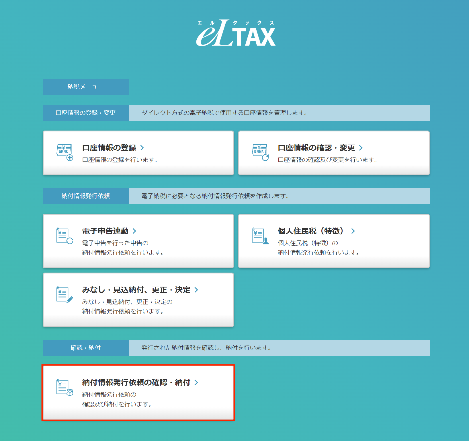 「納付情報発行依頼の確認・納付」メニューを選択します。