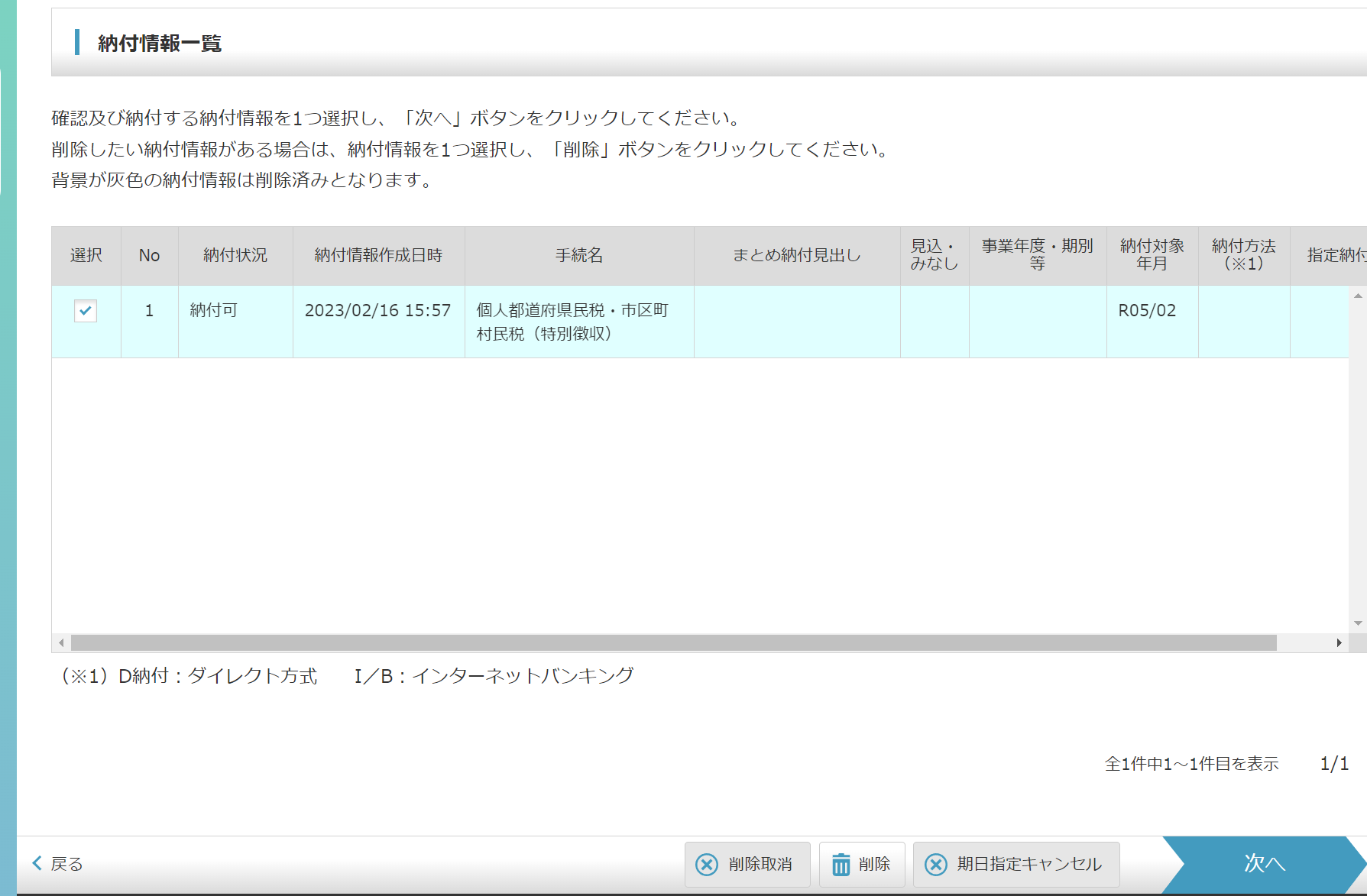 先程発行依頼をした納付情報にチェックし、「次へ」。