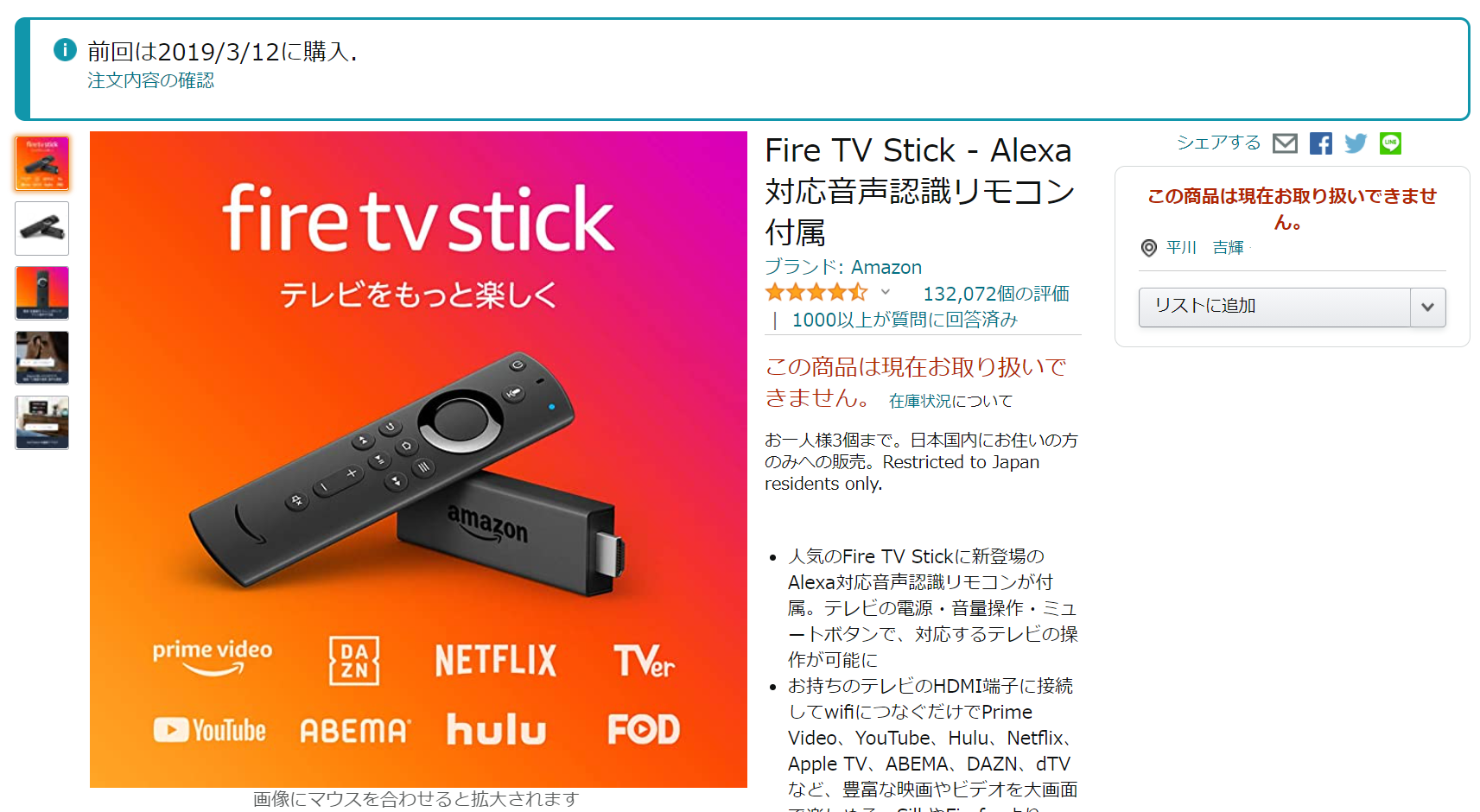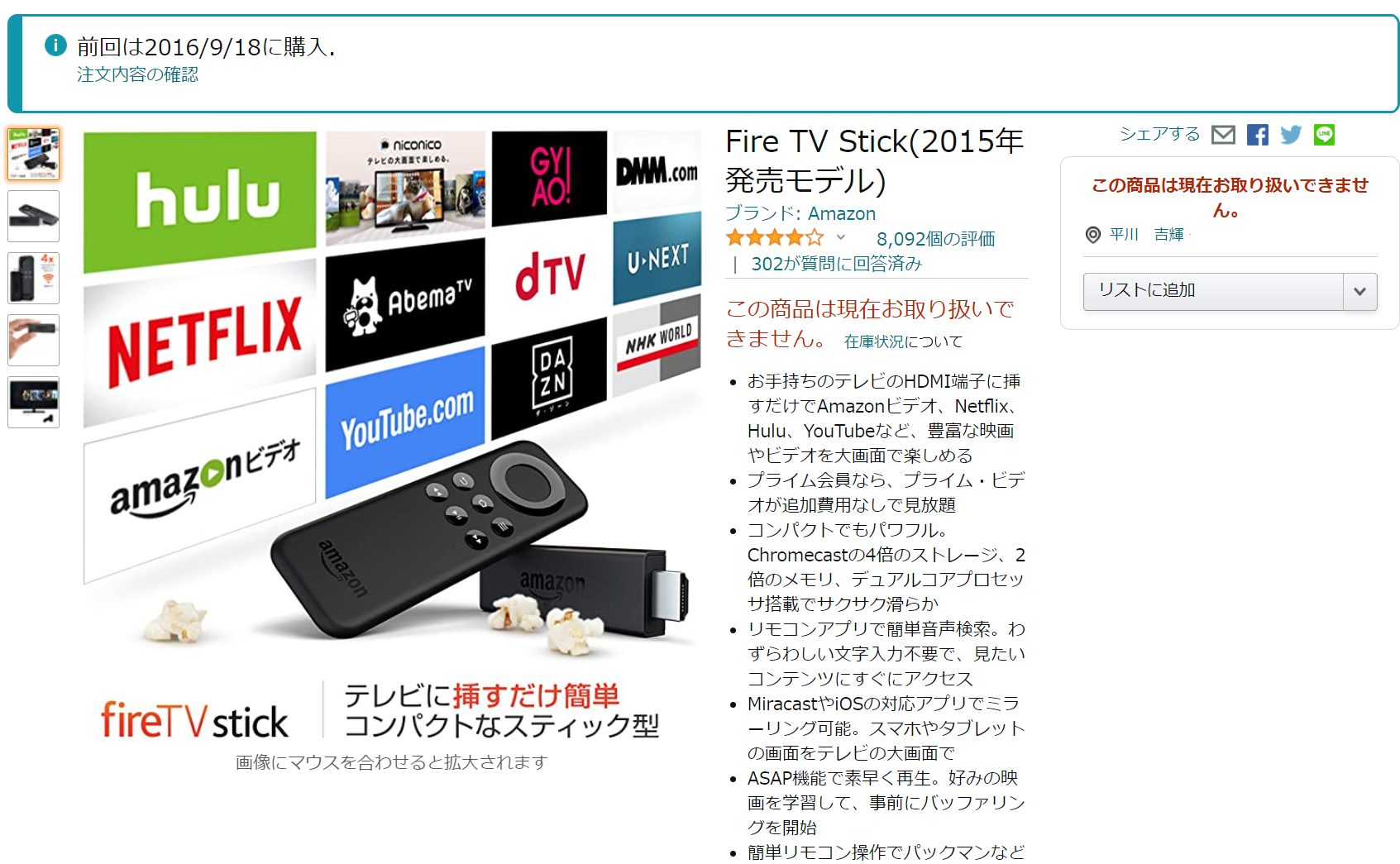 Amazonの注文履歴をみると、1台目Fire TV Stickを購入したのは、2016年9月18日。