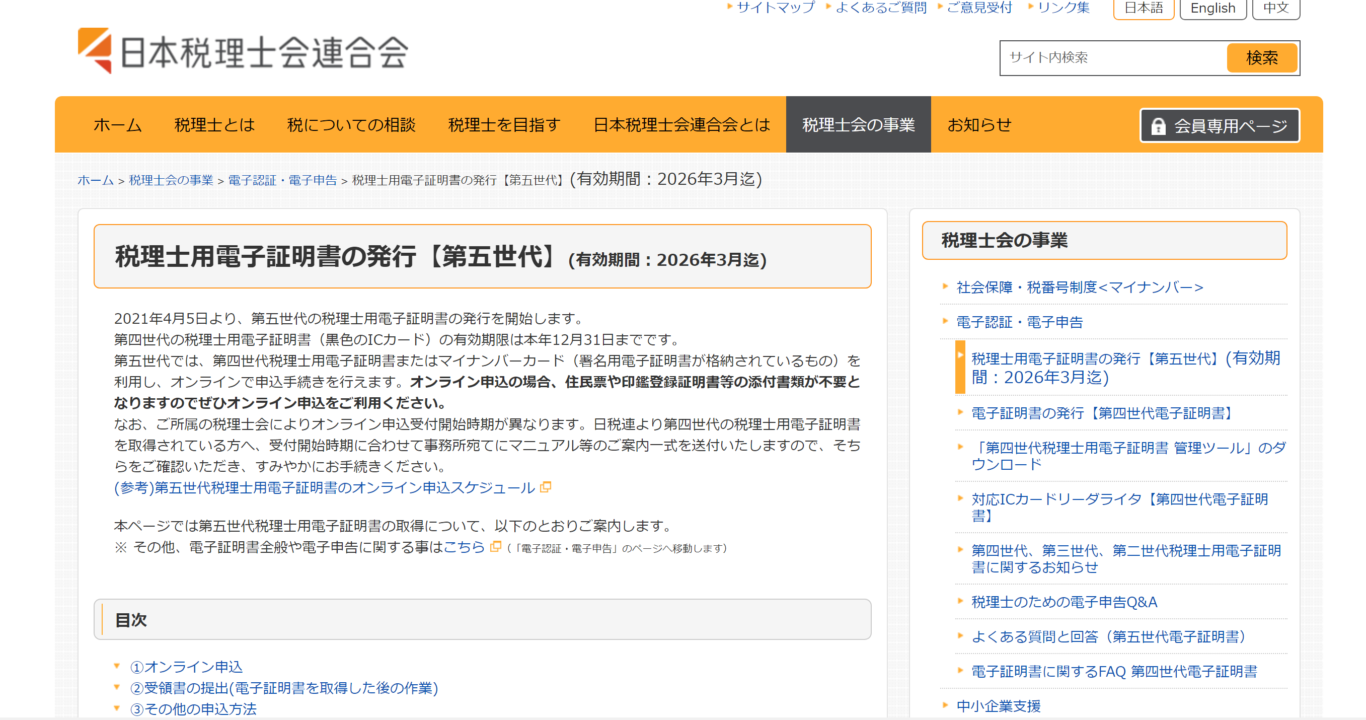 少し下にスクロールすると、第五世代税理士用電子証明書のバナーがありますのでクリックします。