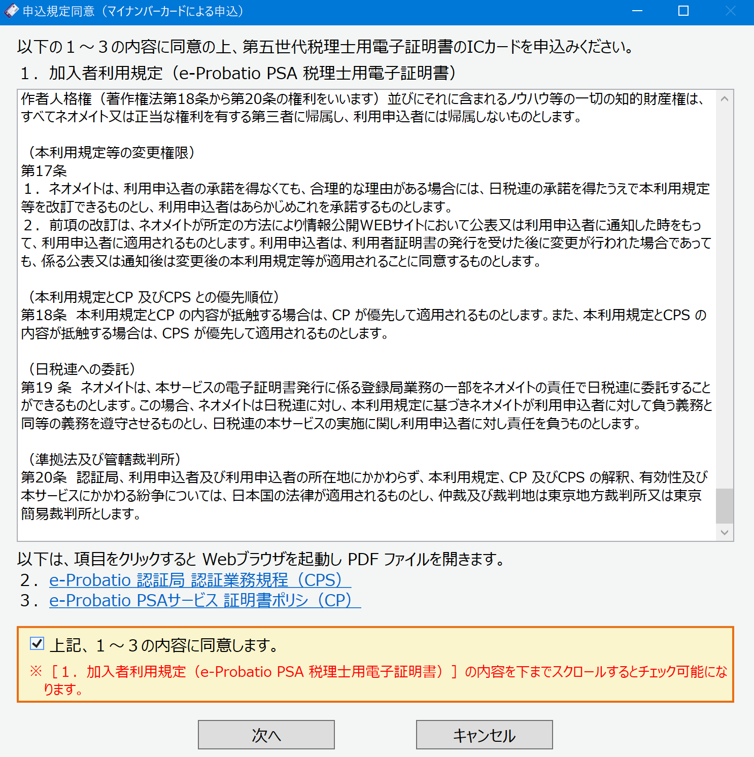 規定を確認したら、下へスクロールしチェックを付けて、次へ。