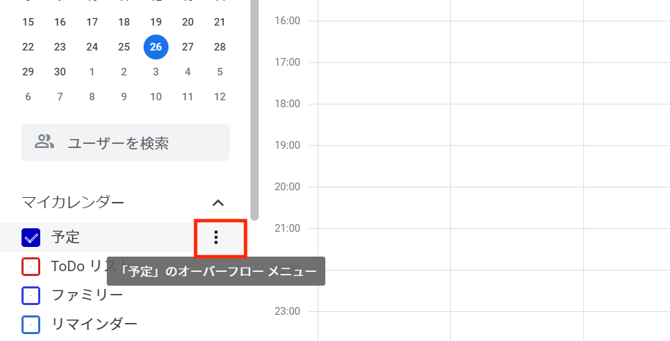 共有したいカレンダーの右側にある「・」が縦に3つ並んだメニューを選択します。