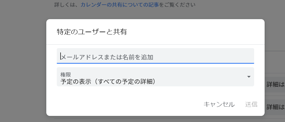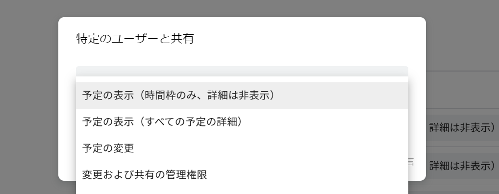 先程のメールアドレスを入力する欄の下に、予定表示の権限を選択するところがあります。