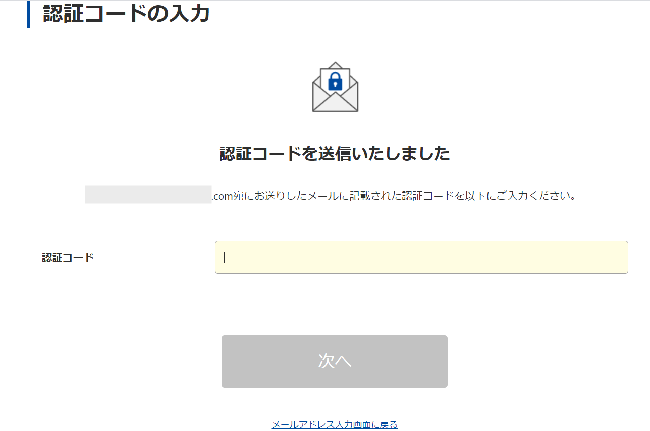 次へですすめると、入力したメールアドレスに認証コードが送られてくるので、入力して次へ。