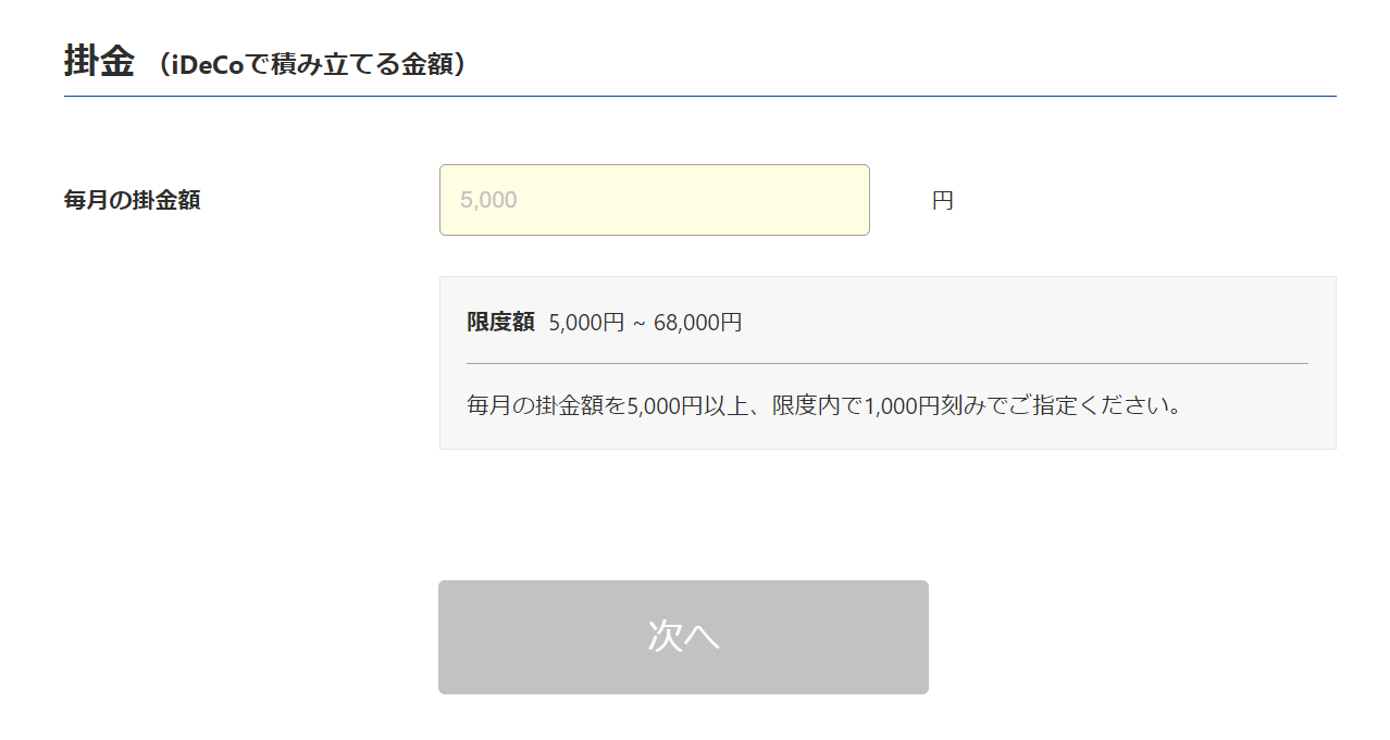 積み立てる金額を入力(5,000円~68,000円の間、1,000円刻み)。