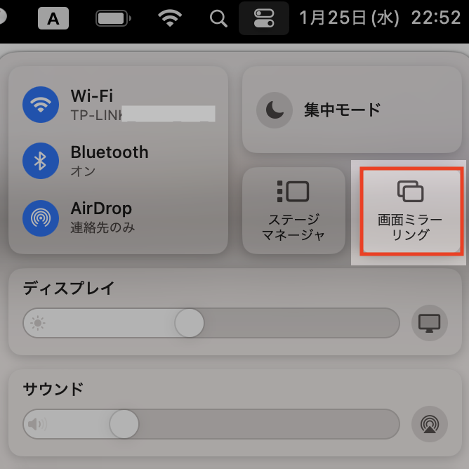 コントロールセンターを開き、「画面ミラーリング」を選択します。