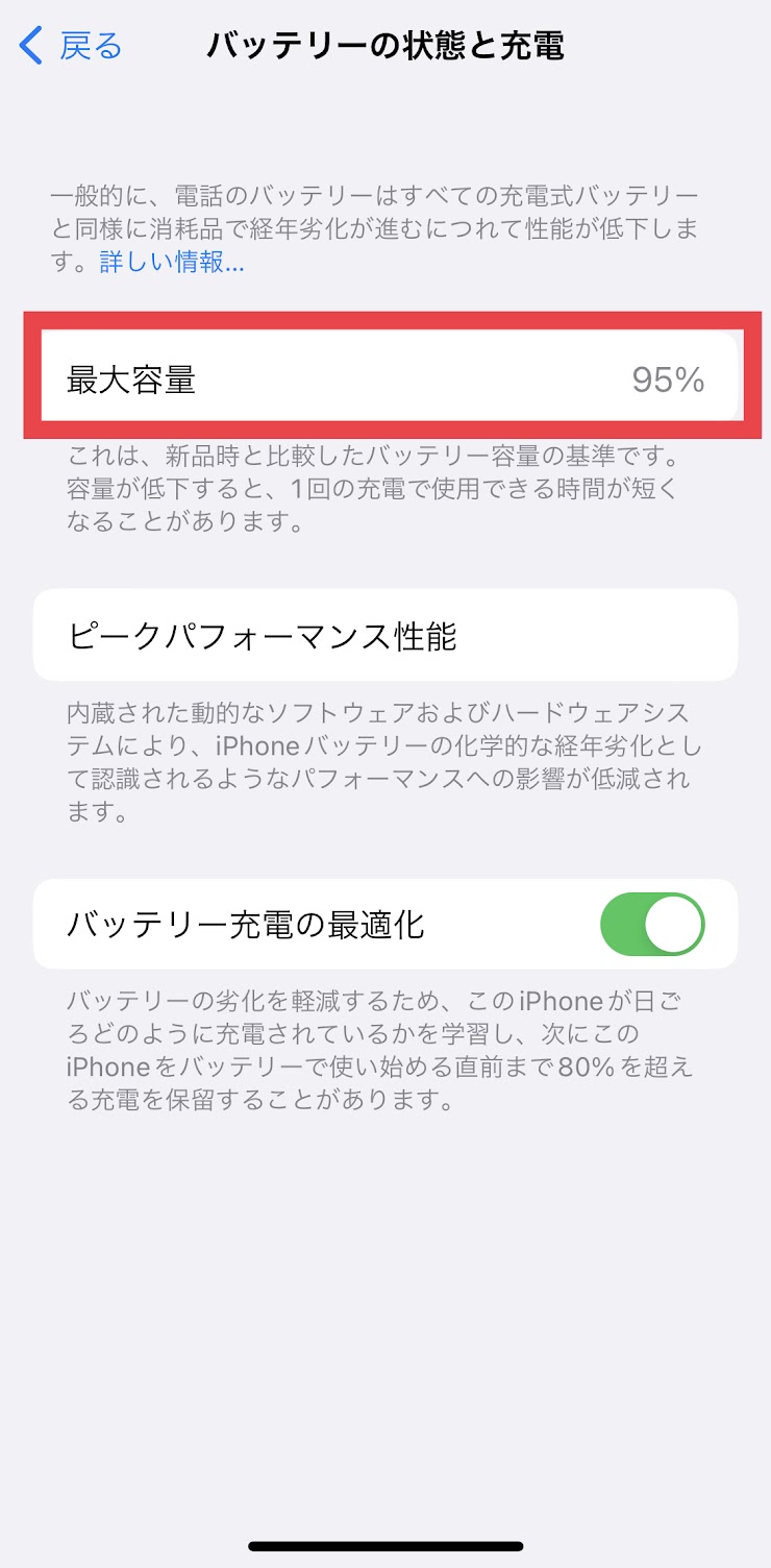 交換時期の目安については、iPhoneの設定から確認できるようです。