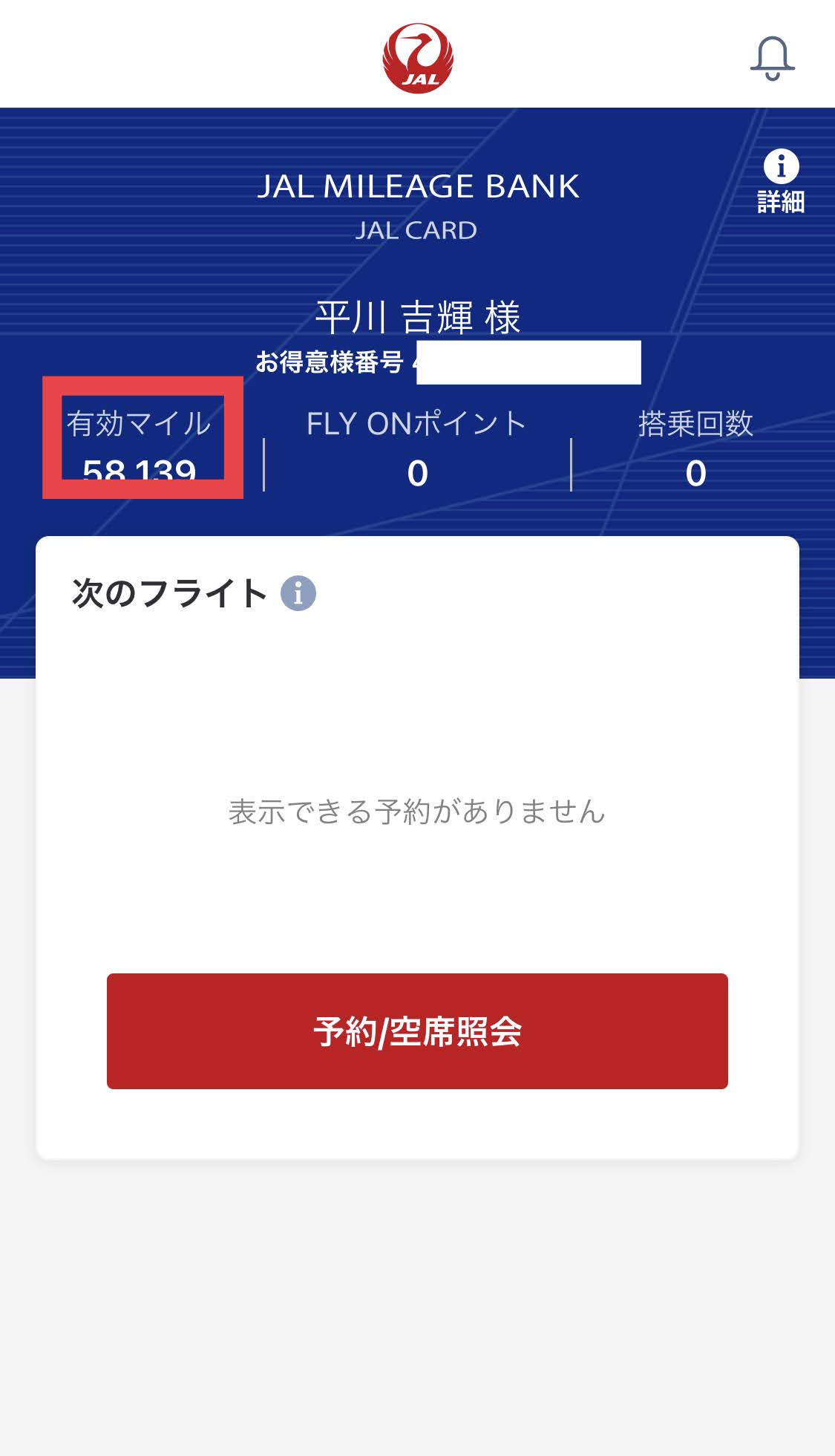 アプリを開き、左側の「有効マイル」のところをタップします。