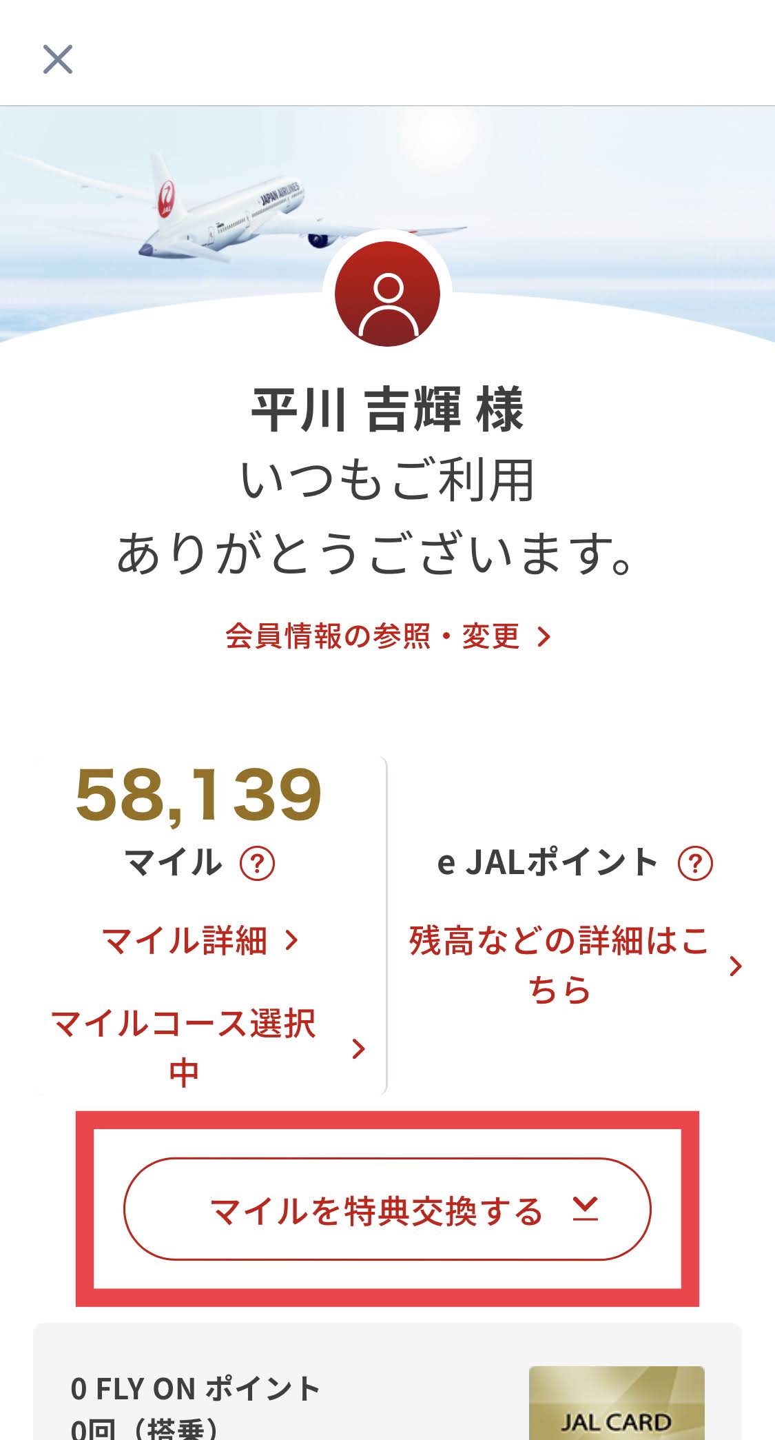 次に、下の方にある「マイルを特典交換する」をタップ。