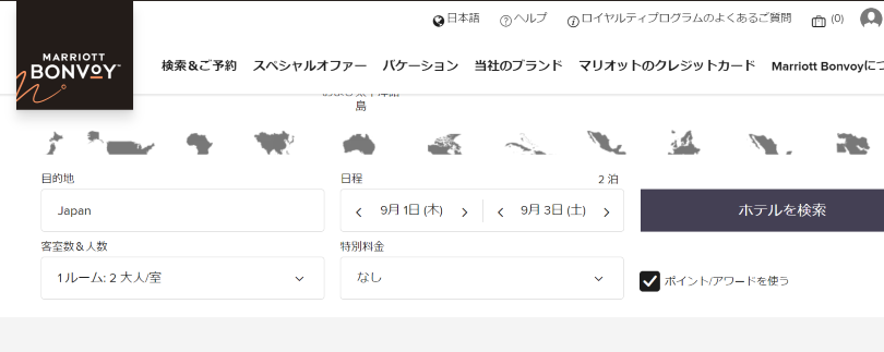 無料宿泊特典での1泊に、ポイント等を使った連泊での予約もできますので、確認してみたいと思います。