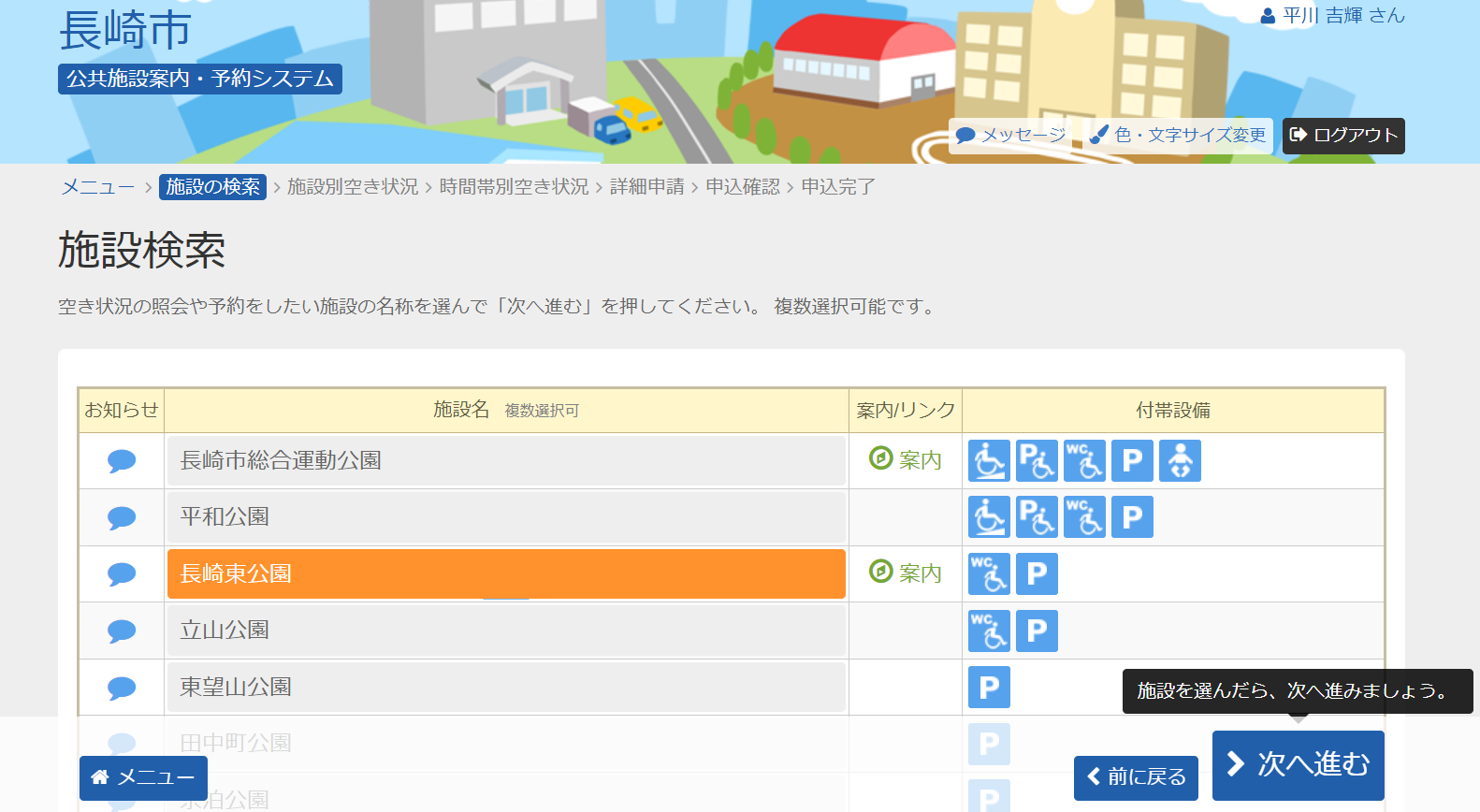 施設名を選択し「次へ進む」を選択。