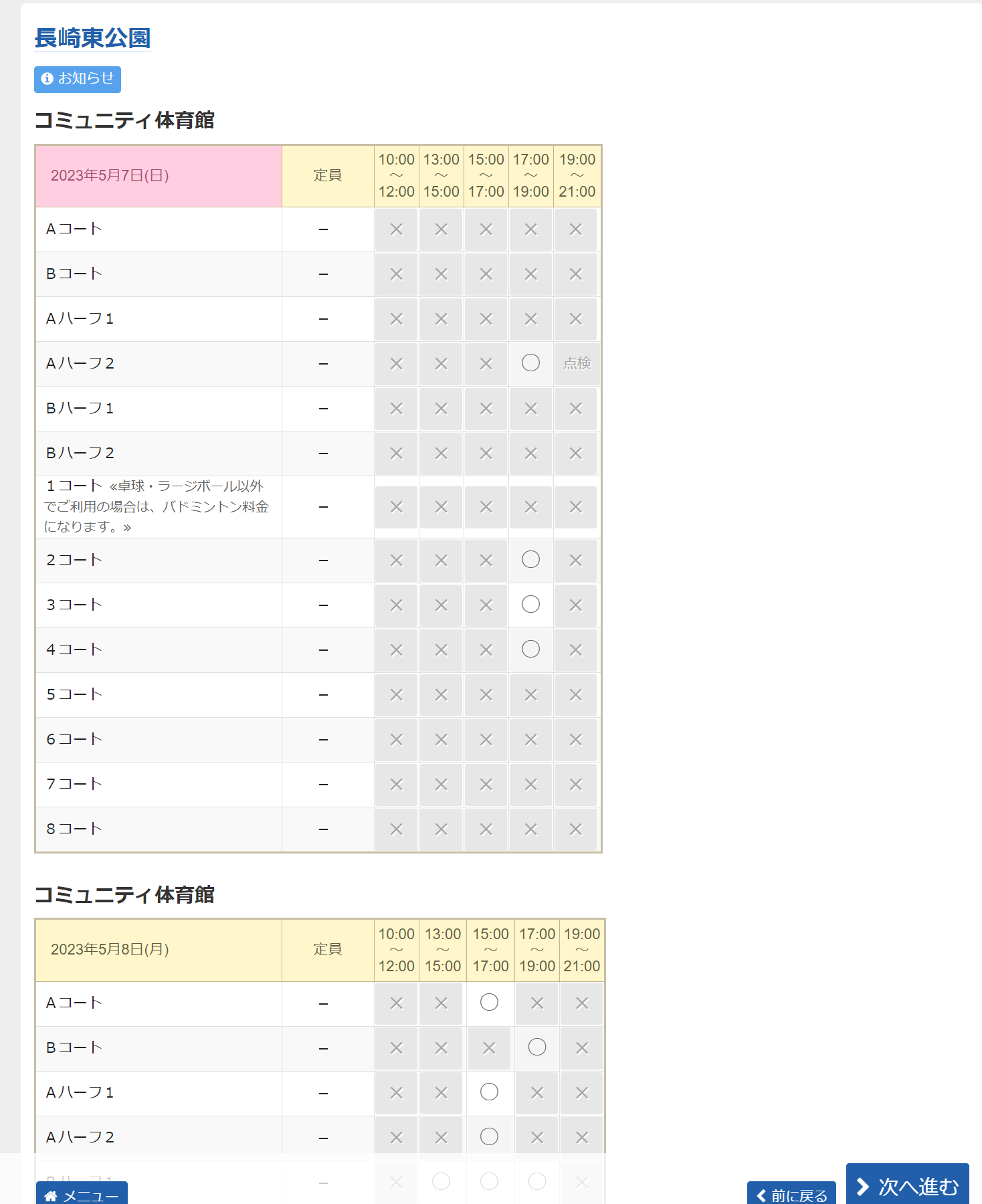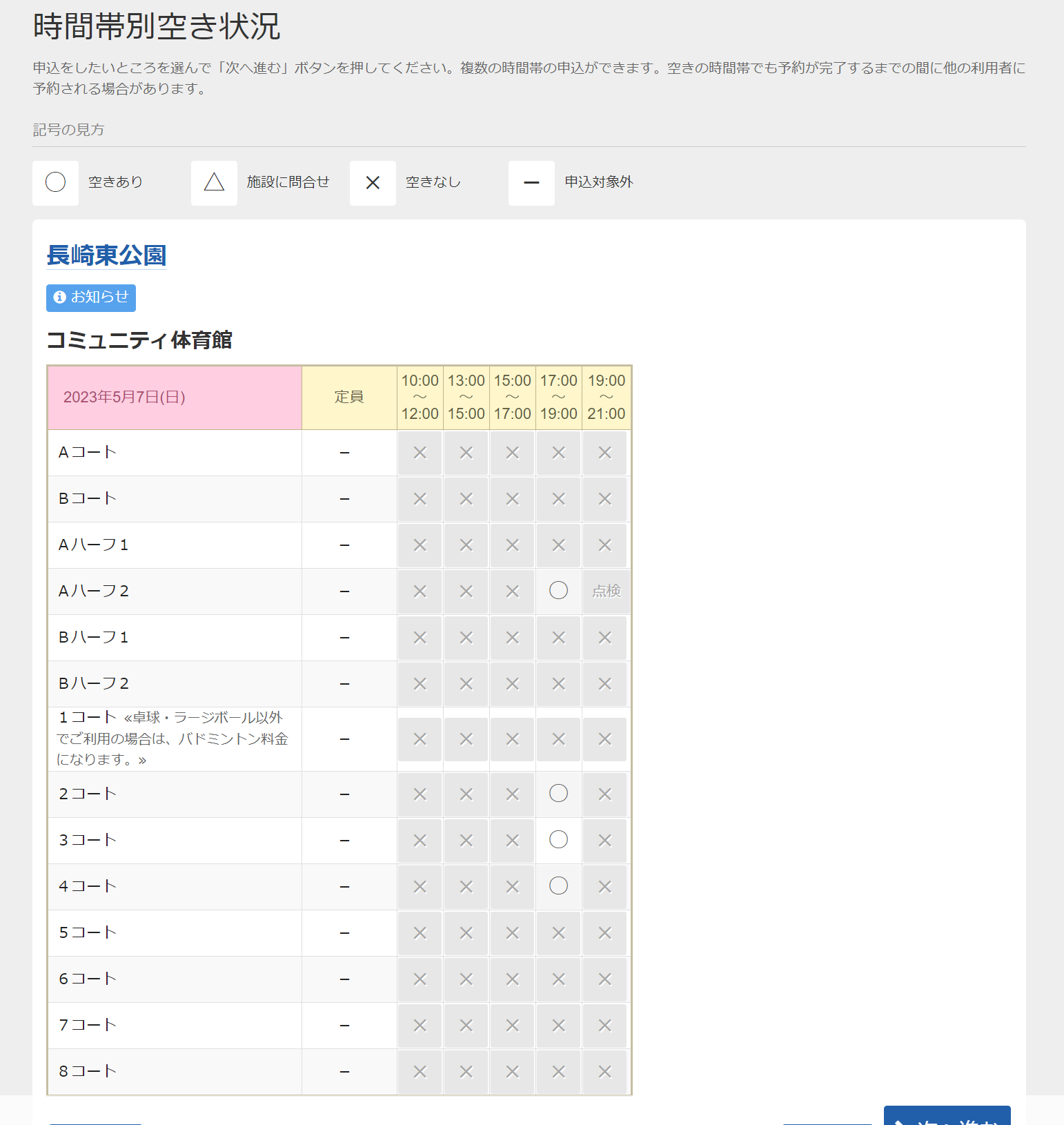 コートの時間帯別空き状況が示されます。