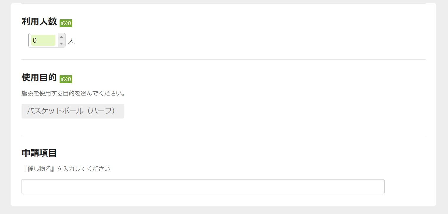 選択して進め、利用人数(必須)を入力し、使用目的(必須)を選択します。『催し物名』は必須ではないので、必要がなければブランクで問題ないようです。