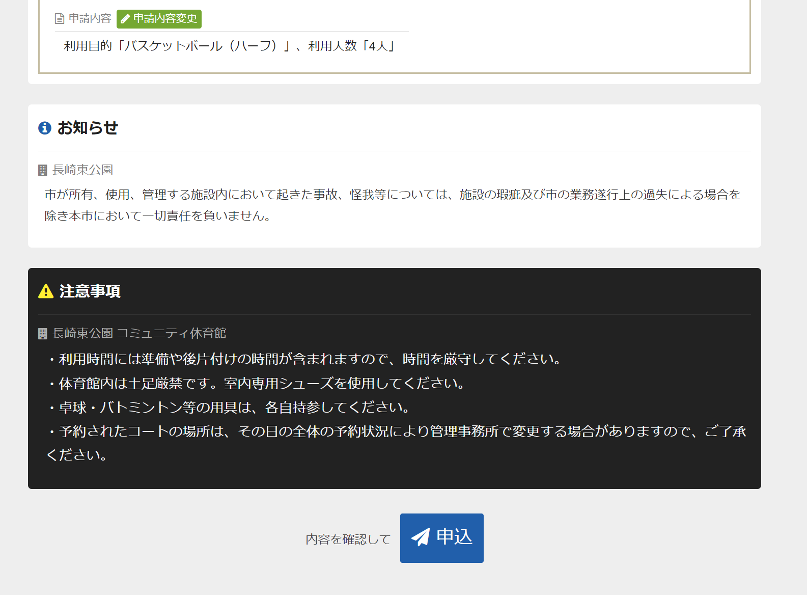 注意事項等を確認し、「申込」を選択すると完了です。