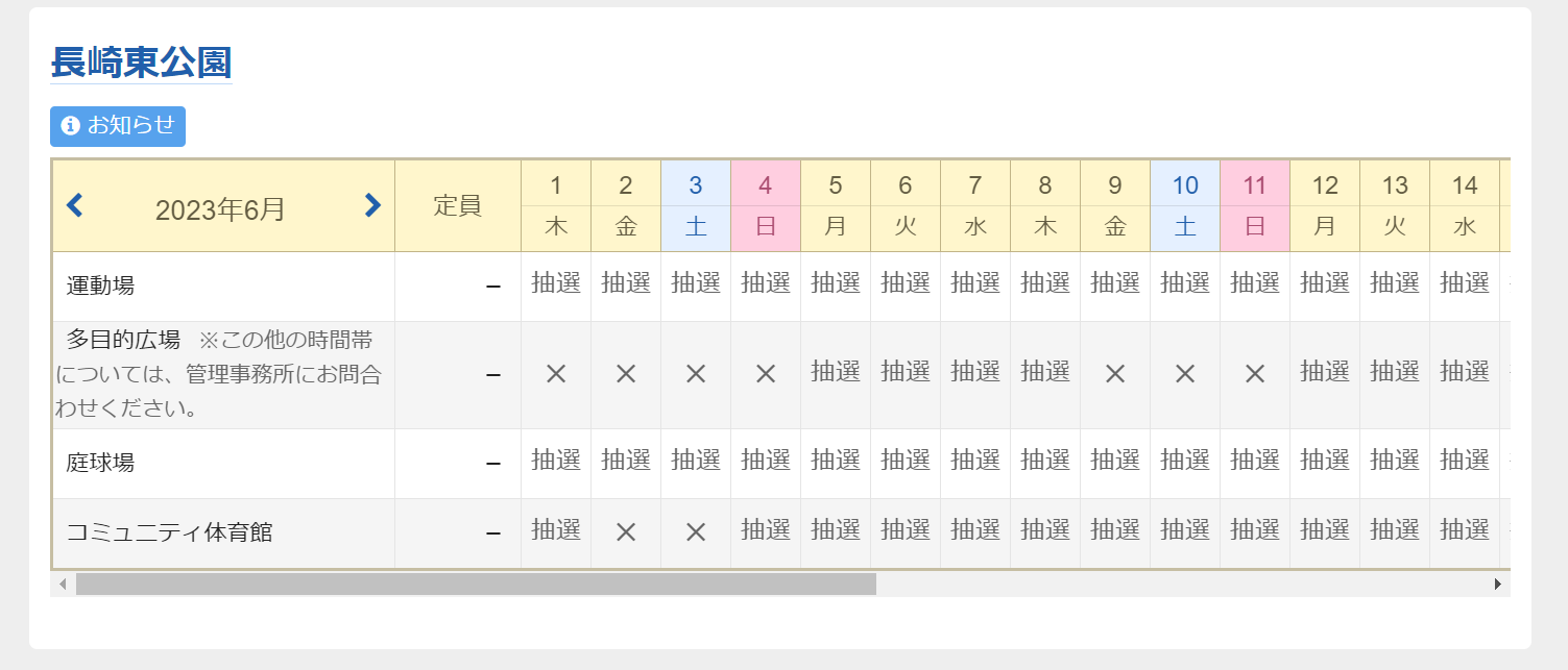 6月の施設別空き状況を表示してみると「抽選」となっています。