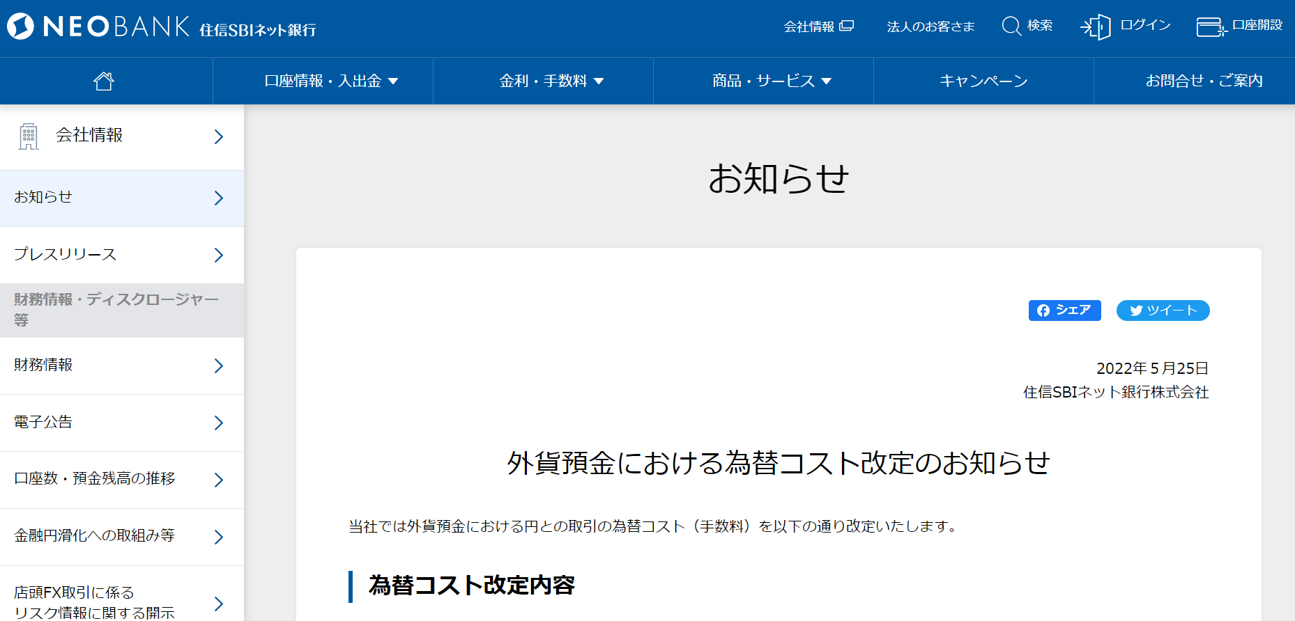先日、住信SBIネット銀行にログインした際、メッセージボックスの重要なお知らせに「外貨預金における為替コスト改定のお知らせ」という内容のお知らせがありました。