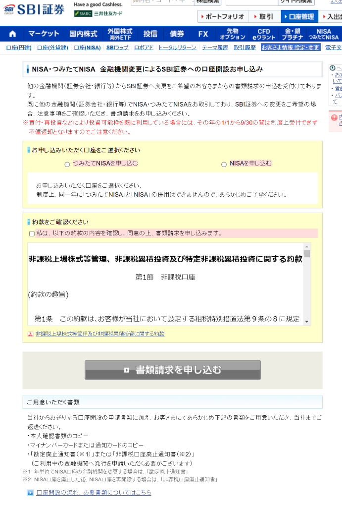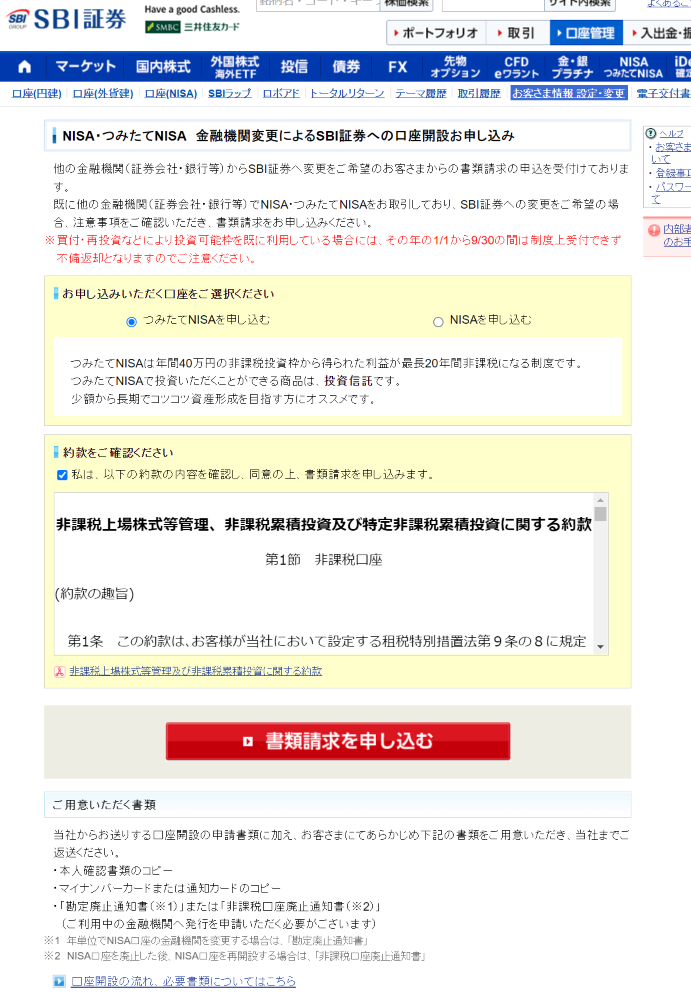 申し込む口座を選択(つみたてNISAか一般NISA)し、約款を確認後、「書類請求を申し込む」ボタンを選択します。