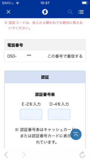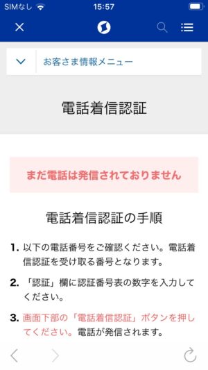 認証暗号表から指定されたコードを入力し、「電話着信認証」を選択すると、登録している電話番号に電話がかかってきます。