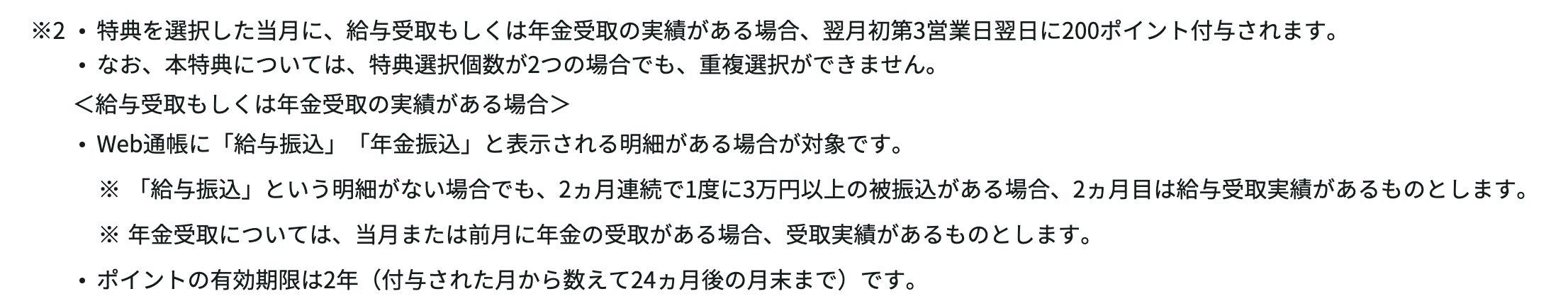 この中で個人的に注目したのは「特典1」の「給与・年金受取特典200ポイント」ですね。