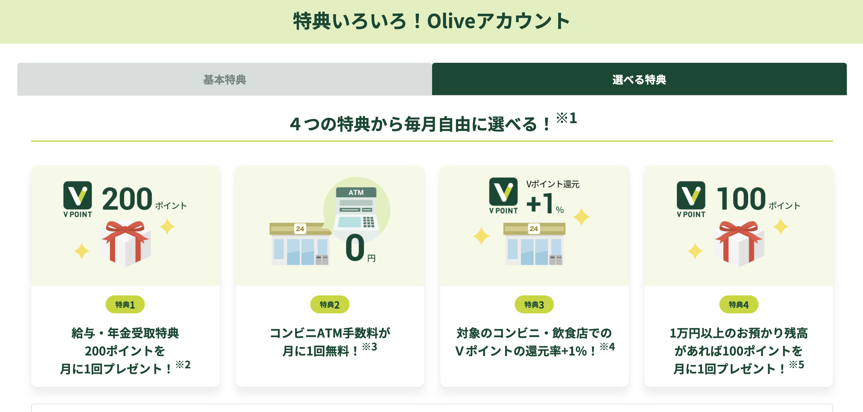 Oliveアカウントの特典には「基本特典」と「選べる特典」が用意されています。
