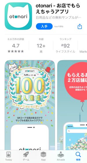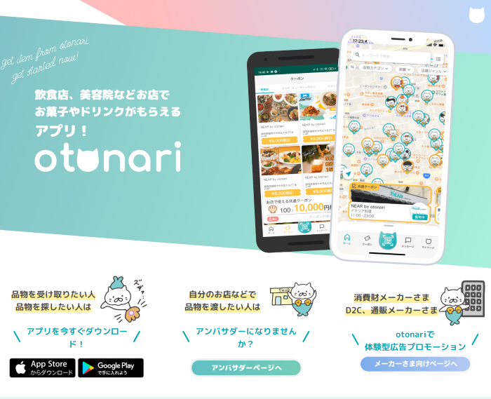 飲食店や美容院などでお菓子、ドリンクなどの試供品を無料でもらえるアプリ「otonari」。
