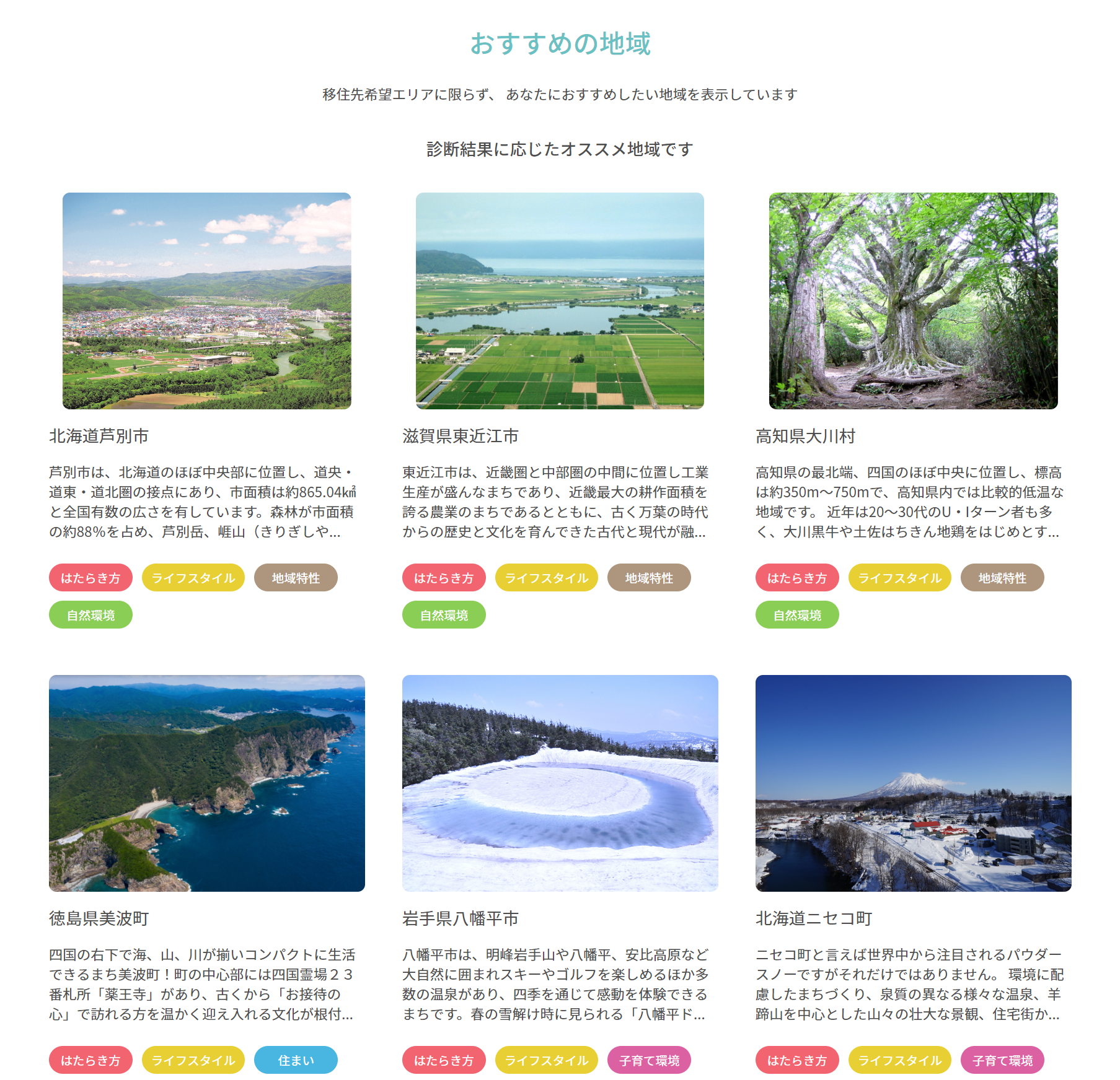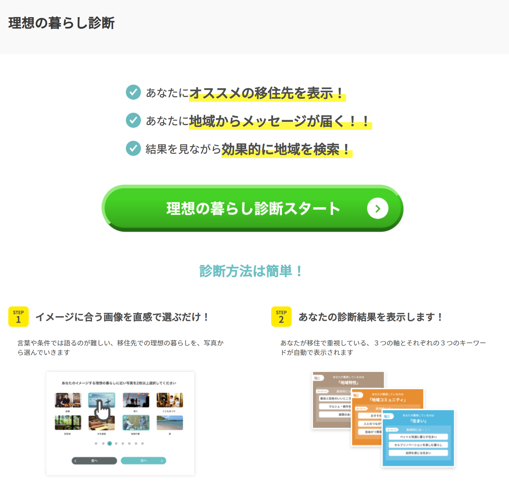 画像を直感で選ぶだけで、自分にピッタリな移住先をおすすめしてくれ、自分が重視しているコトがわかるというもの。