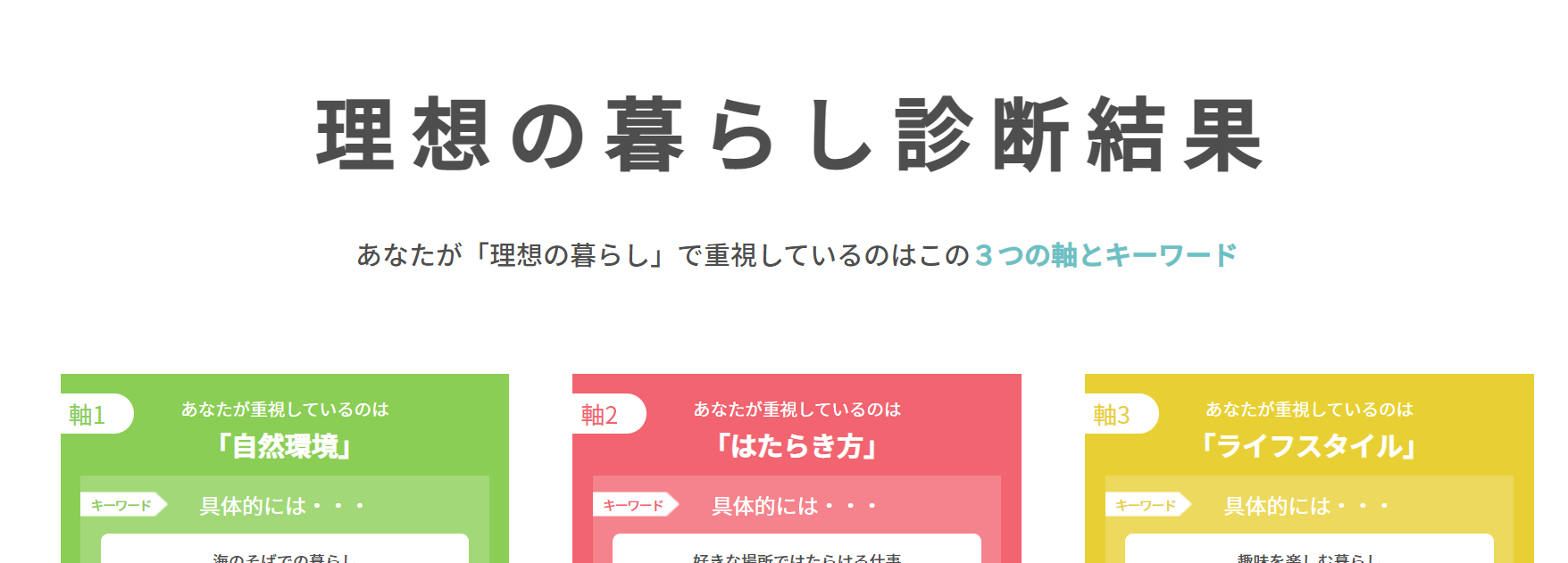 何ターンか選択を続けると、「理想の暮らし診断結果」が表示されます。