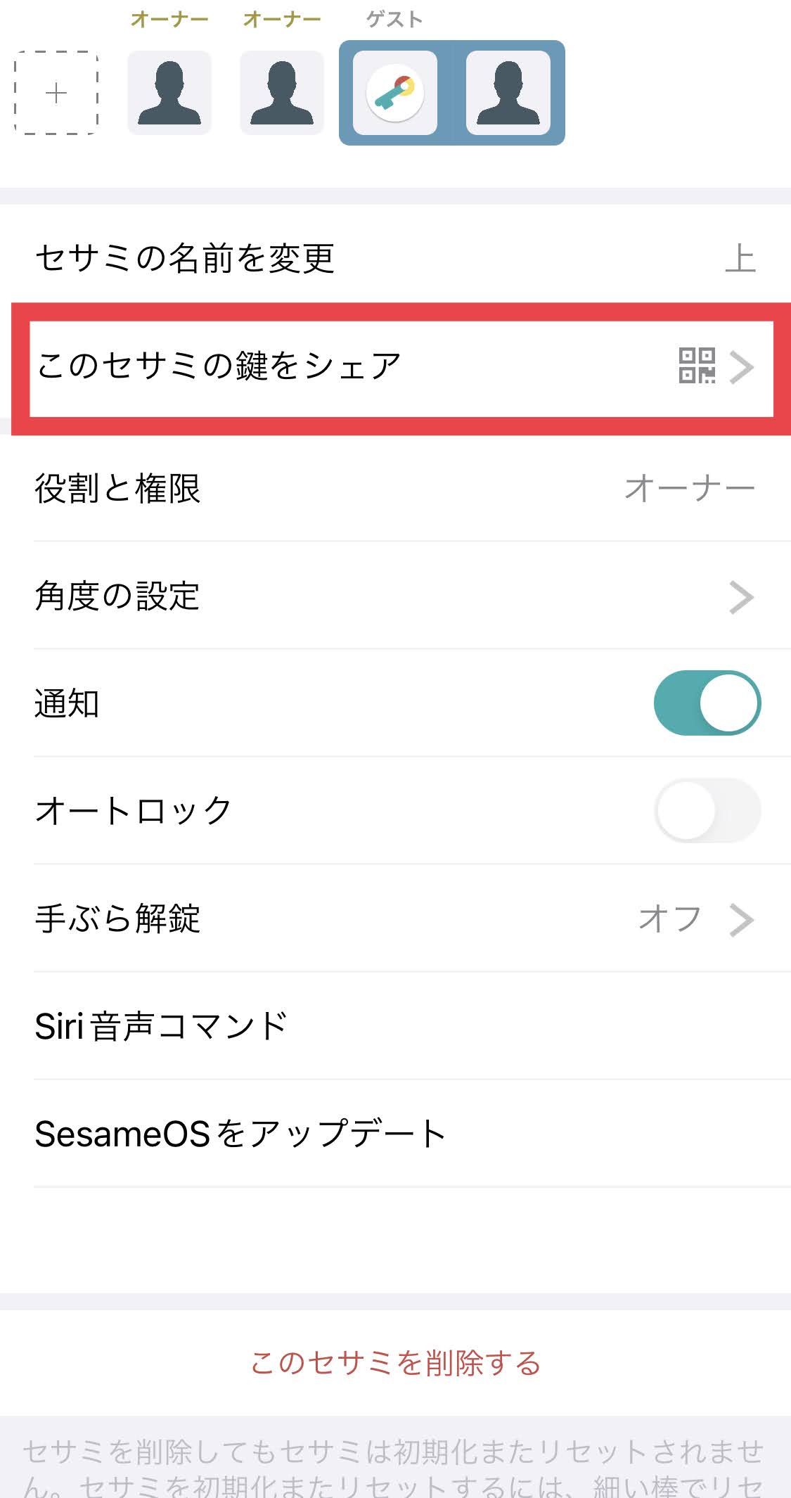 鍵の種類が「オーナー鍵」・「マネジャー鍵」・「ゲスト鍵」とありますので、状況にあった鍵をシェアすればよいかと。