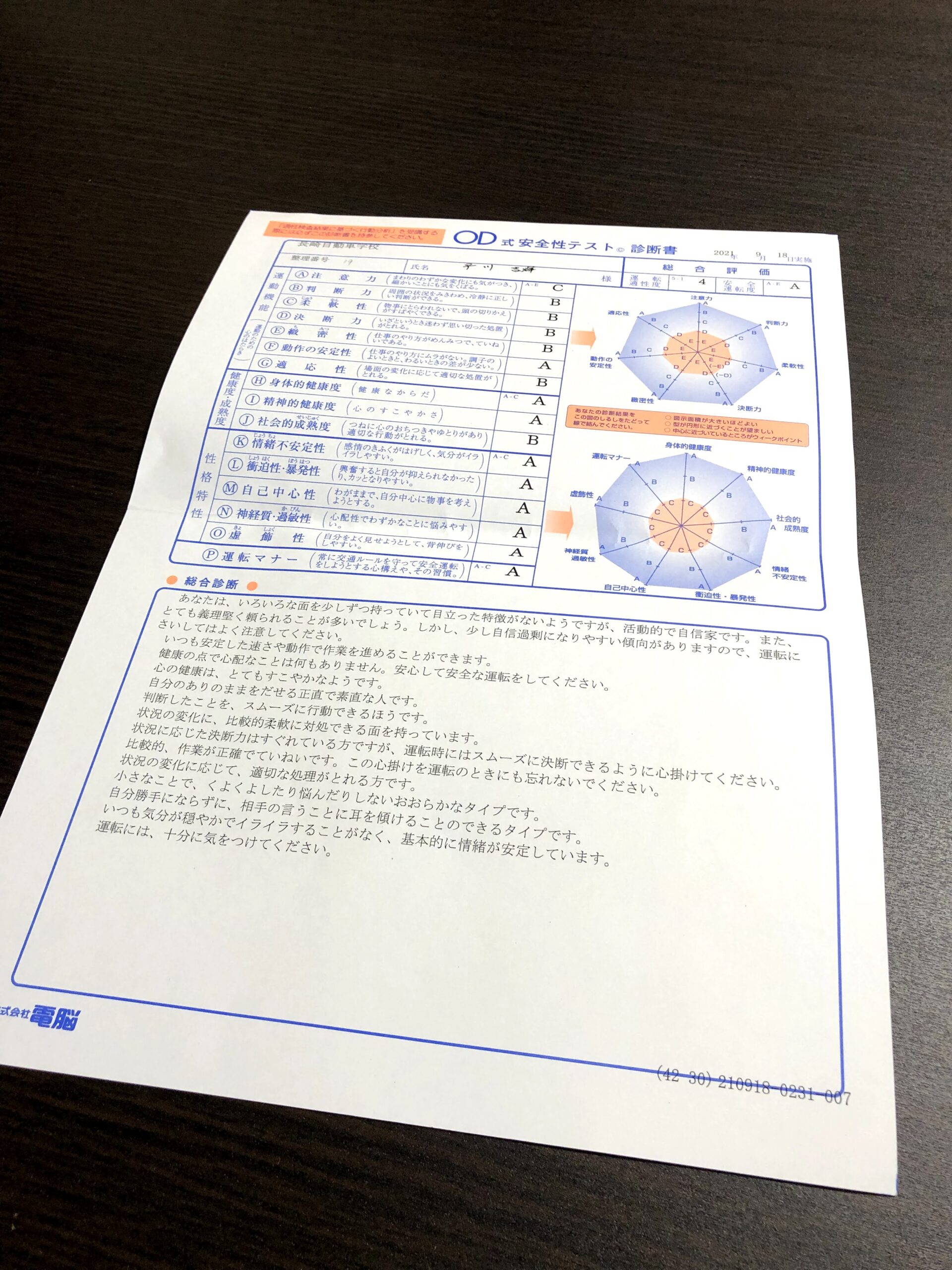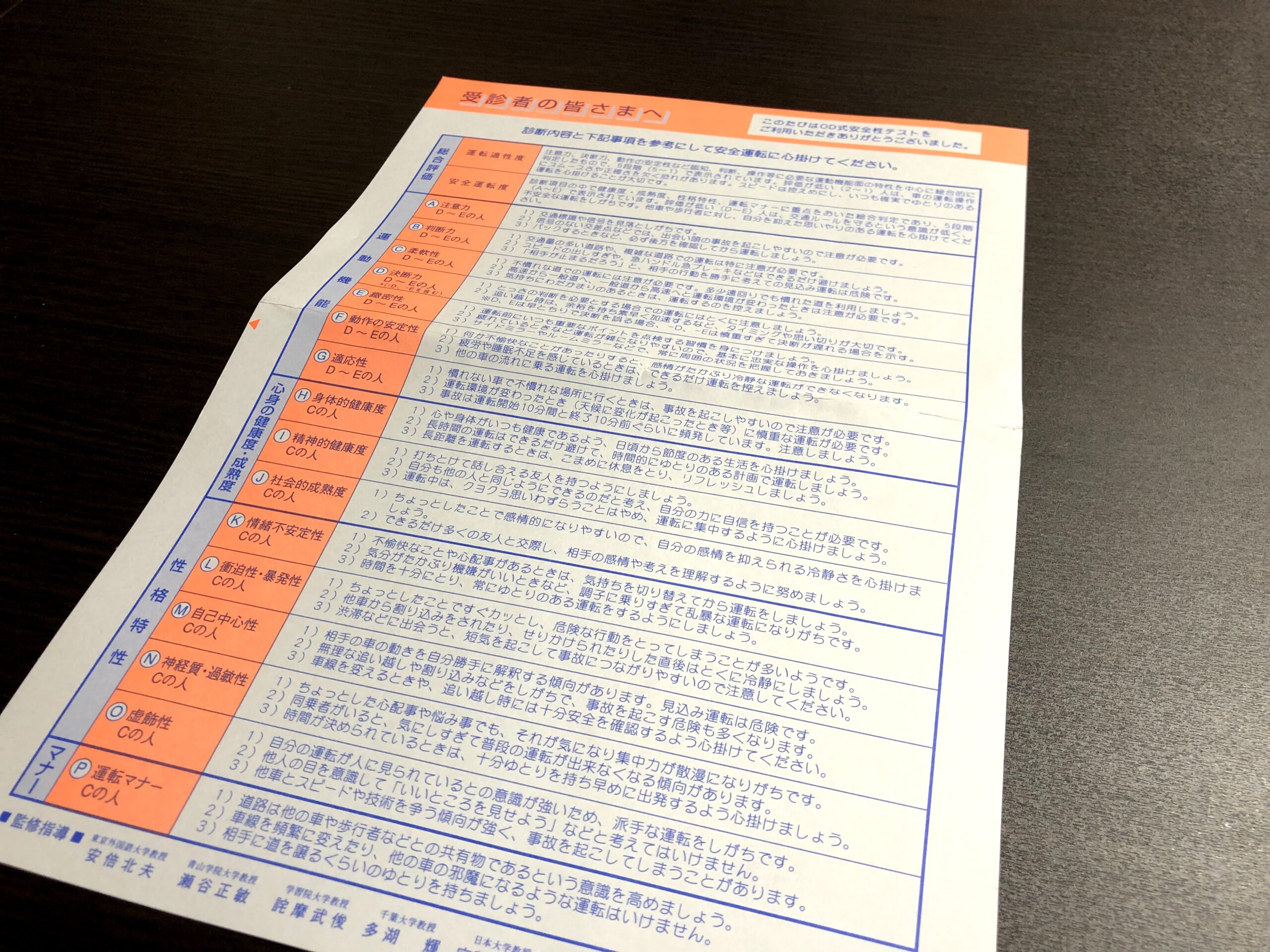 先日自動車学校で実施した適性検査(OD式安全性テスト)の受診結果をいただきました。