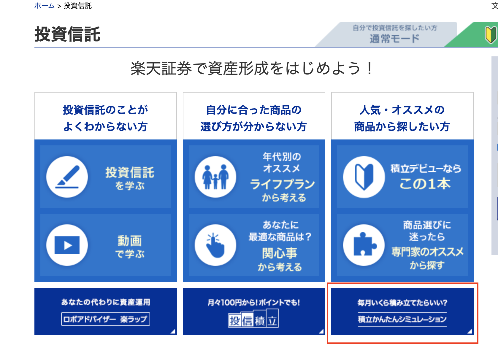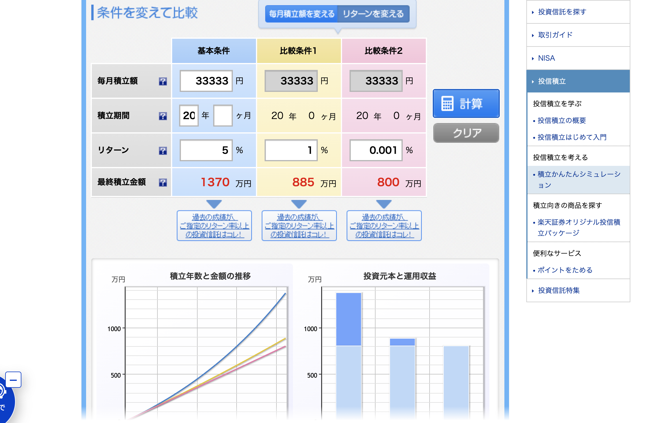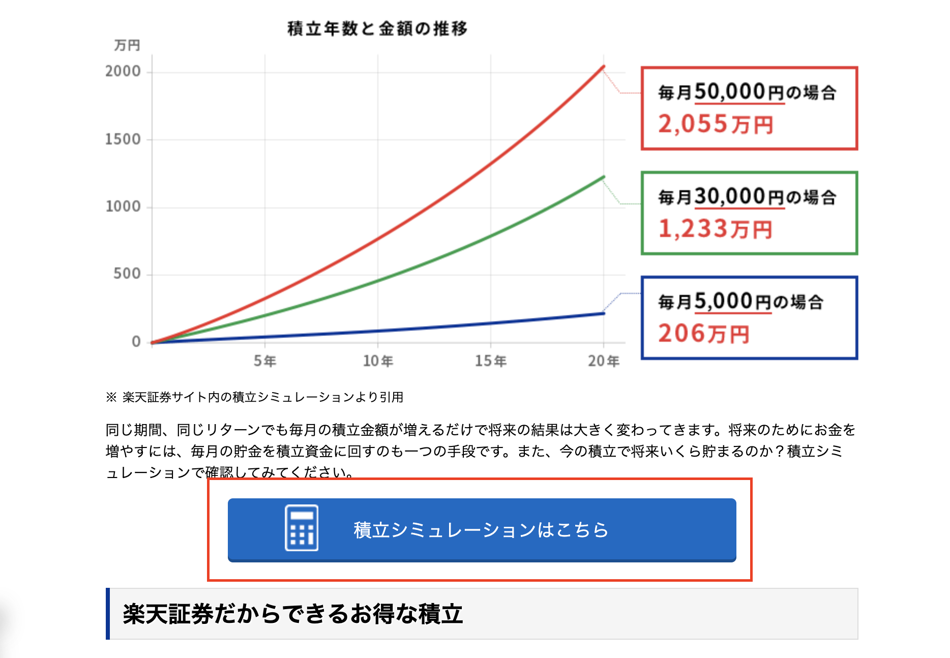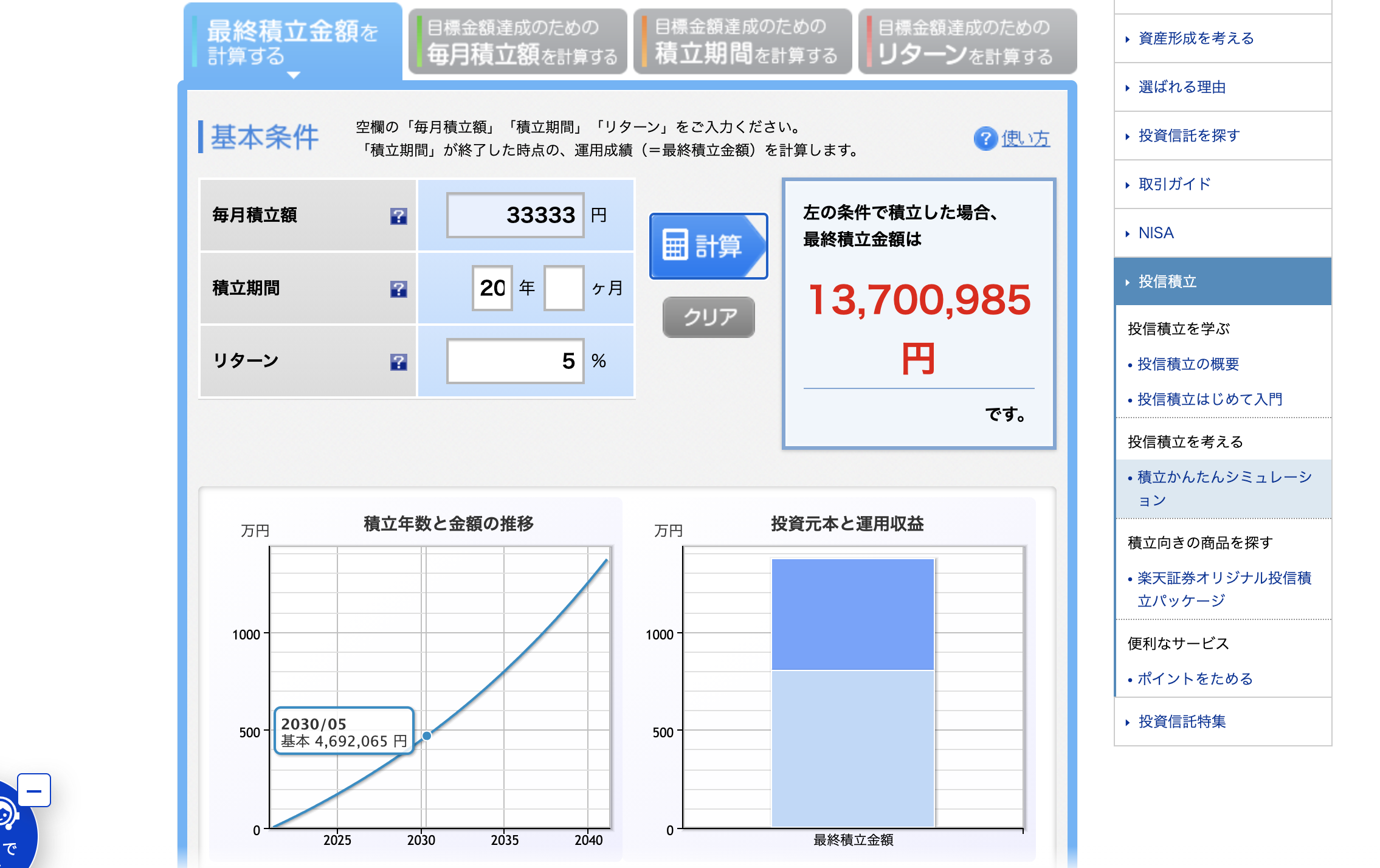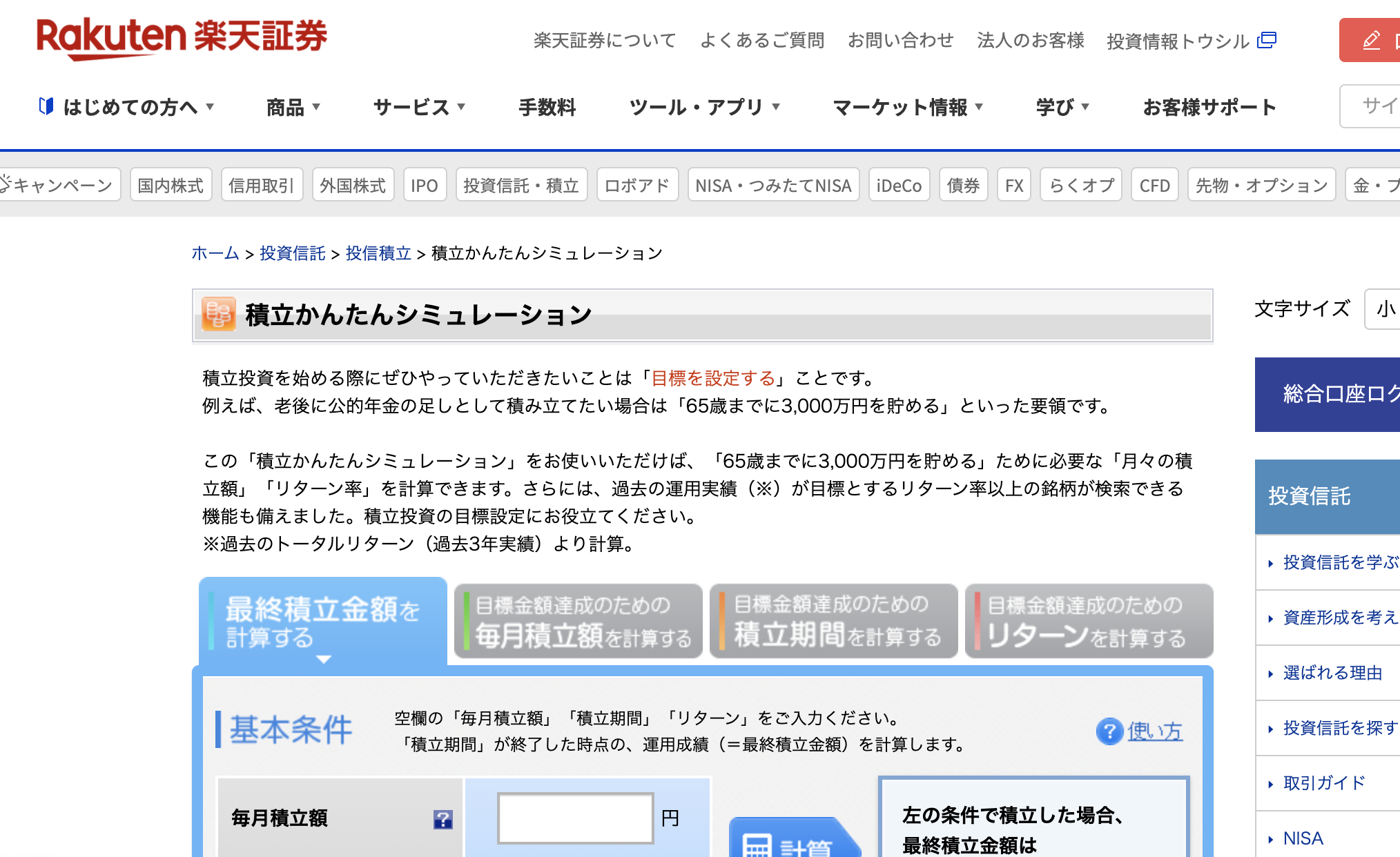 楽天証券に簡単にシミュレーションできるページがありますので、ご紹介します。
